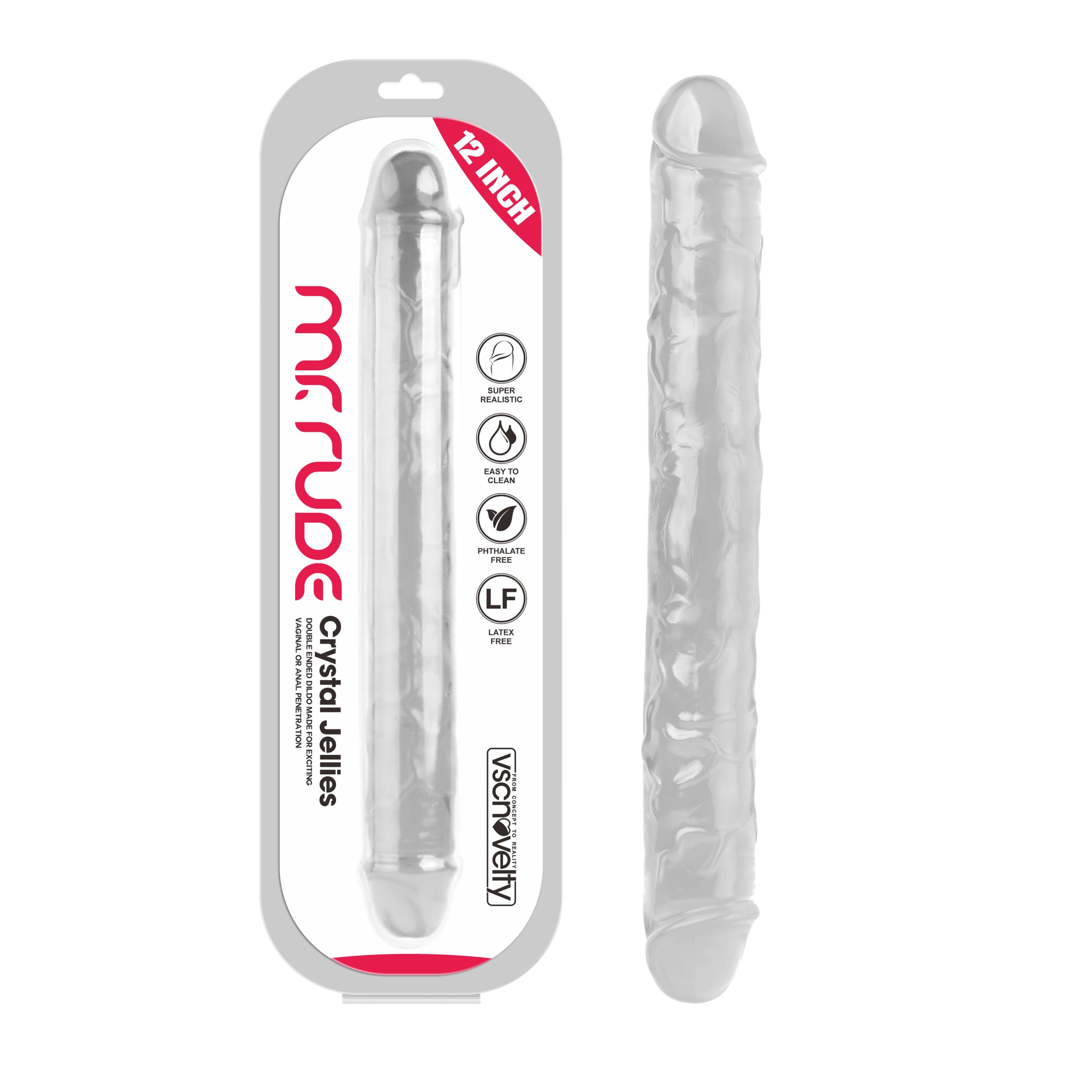 Both of you can have a piece of the pecker pie when it comes to all 12 inches of this realistic double-ended dildo from Crystal Jellies. One end is for you, and the other is for your boo, with this firm but flexible toy made for vaginal or anal dual-penetration.A jelly mold has been designed with raised veins and a girthy tip at each end for a realistic feel 10 inches of insertable length are available in total, meaning the choice is yours on how deep you want to take it with or without a partner.Add a hearty slather of water-based lubricant to both ends of your dildo, and let your imagination run wild.A note for vagina owners – ensure you do not insert the same end into your vagina after it has been inserted anally.Key Features:12 inch, double-ended dildo made for exciting vaginal or anal penetrationRaised veins and girthy tips create a lifelike look and sensationA flexible 10 inches of insertable length make for ultra-satisfying partnered or solo playMaterial:TPEColor:Purple/Pink/ClearPower:NoLength:12 inchesInsertable:10 inchesDia:1.5 inchesPackaged Size:35.5x12x4.5 cmPackaged Weight:0.3kg