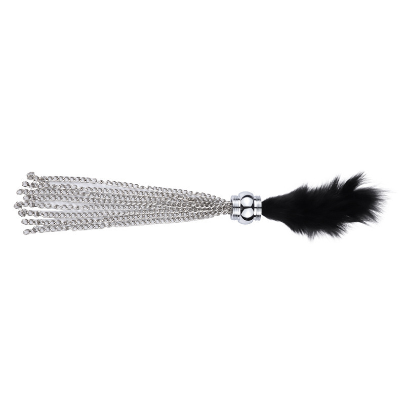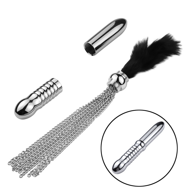 Material: Metal Color: Black + Silver Plug Size: 22 * 3.5 cm/8.7 * 1.4 inch Tickler Size: 27 cm/10.6 inch Whip Size: 34 cm/13.3 inch Package: OPP Bag