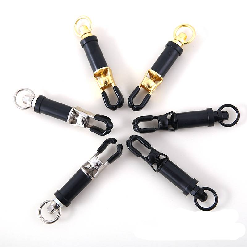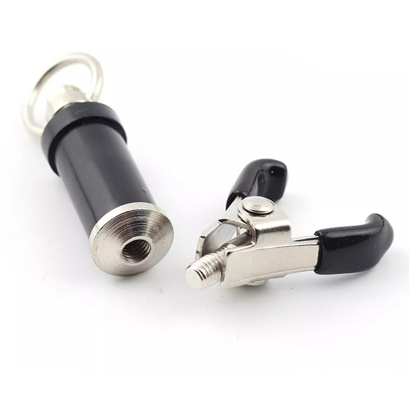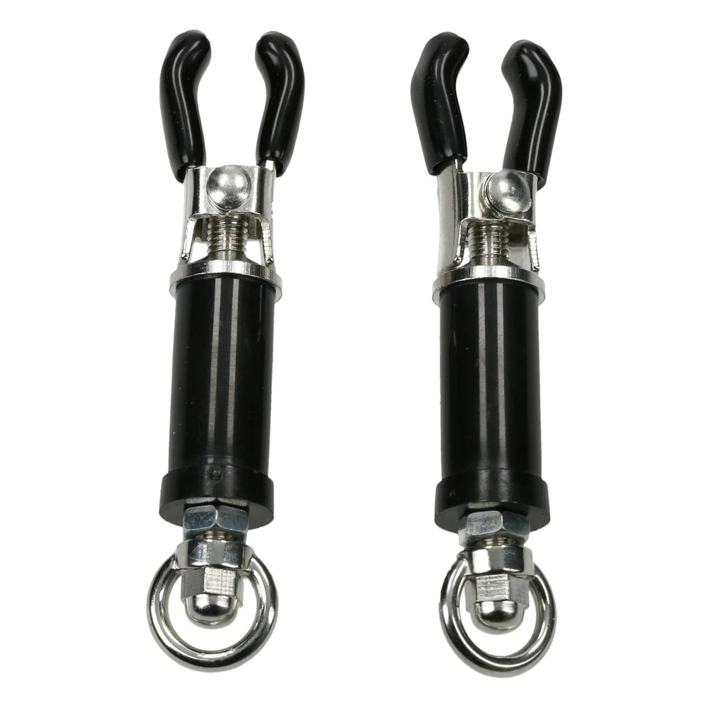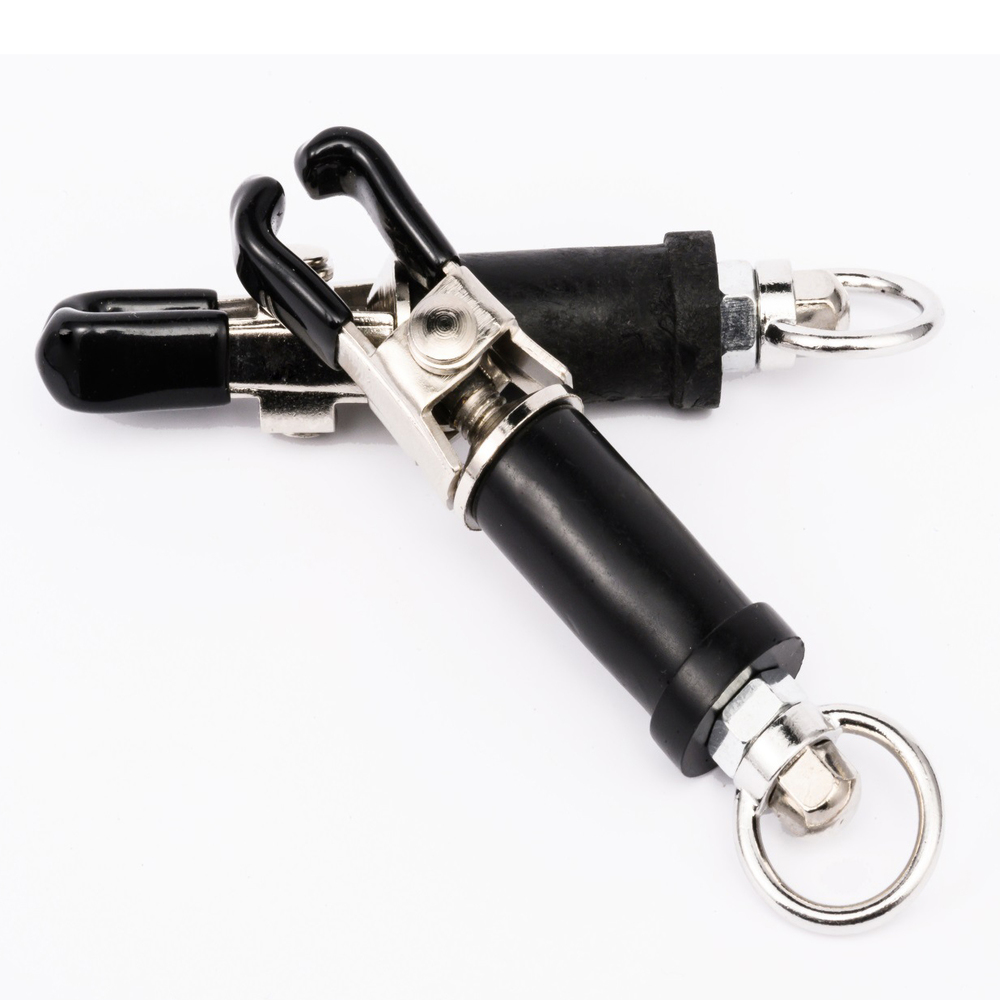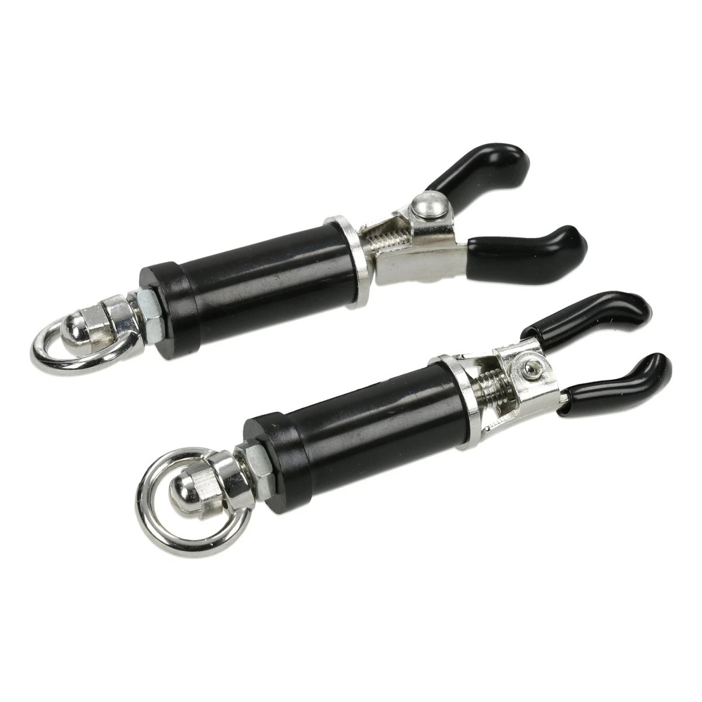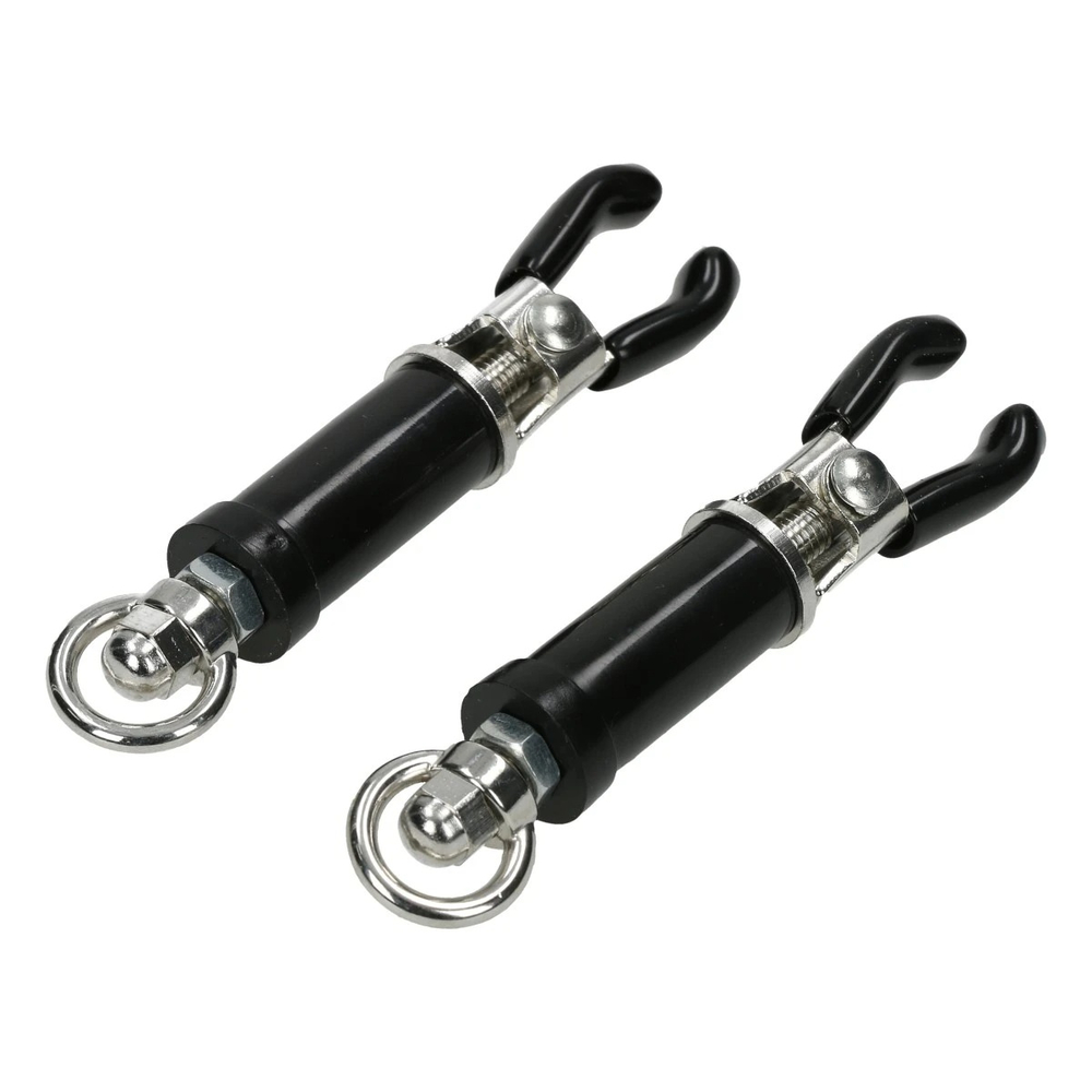 The Bondage Ring Barrel Clamps provide you with the framework for a wide array of torments. These heavy-duty clamps feature a dangling ring at their base that affords you countless bondage options. Let the rings hang and jingle as your sub moves around. Attach a chain from one ring to another that will swing with their movements and provide a slight tug, or a set of hanging weights for even more of a pull. The rings are perfect for attaching independent ropes or chains to create any nipple torture setup that you can imagine. The clamps are highly adjustable via their threaded barrels – no forgiving spring-loaded clamps here! Just screw them down tight for unrelenting pressure! Their rubber-coated tips keep your lover from having to remember their safe word (at least for now!). Measurements: 4.57 inch overall length (including rings), 1.12 inch inner diameter ring pulls, 0.55 inch diameter barrels Material: Coated Brass, Rubber Color: Black and Silver