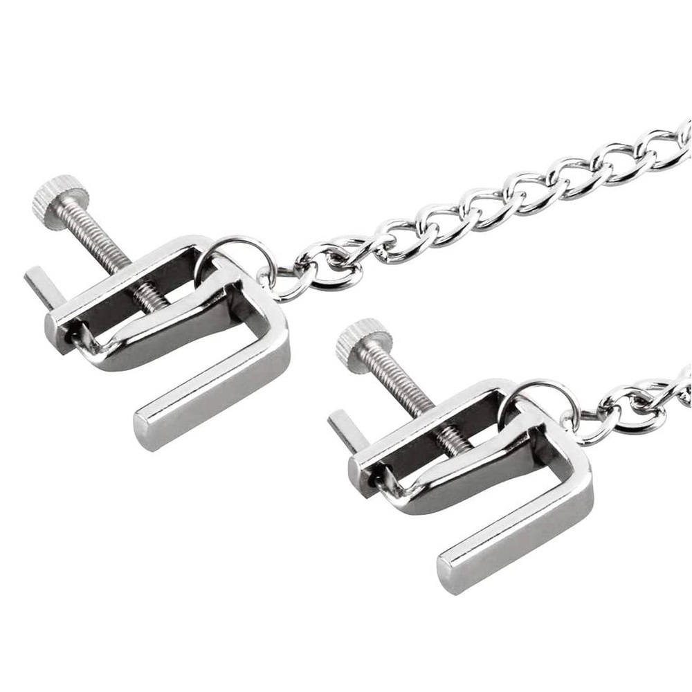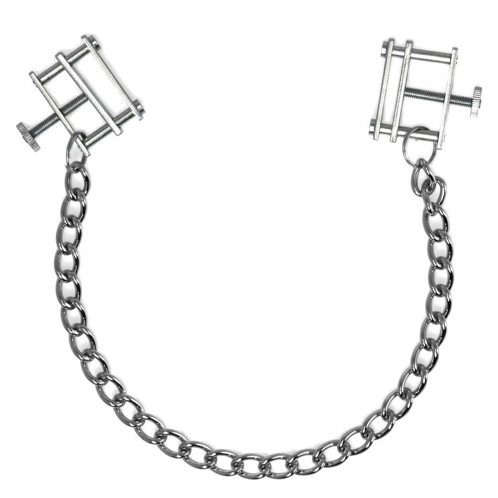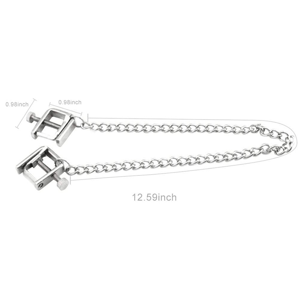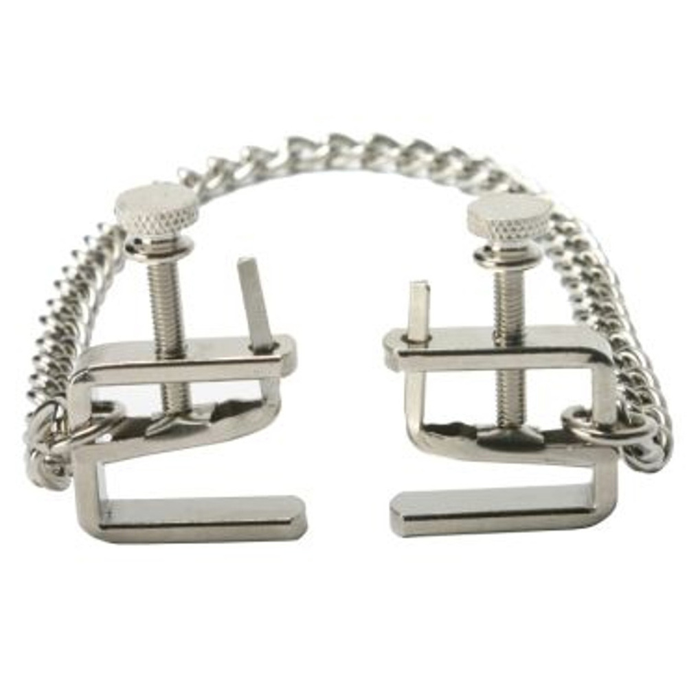 These adjustable “C-Clamps” get their namesake from their shape. These clamps are great for beginner or advance nipple play. These clamps have a 1″ thumbscrew that allows the user to adjust the intensity of the pressure applied. These clamps are 3/4 inch long by 1/4 inch wide with a 12 inch silver chain connecting the two clamps together.