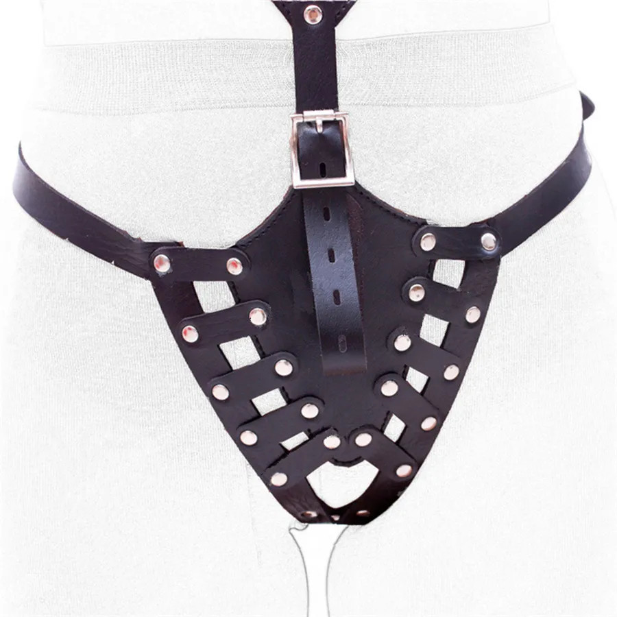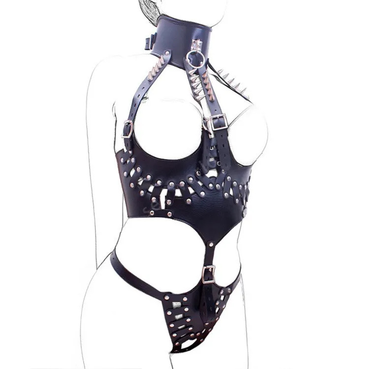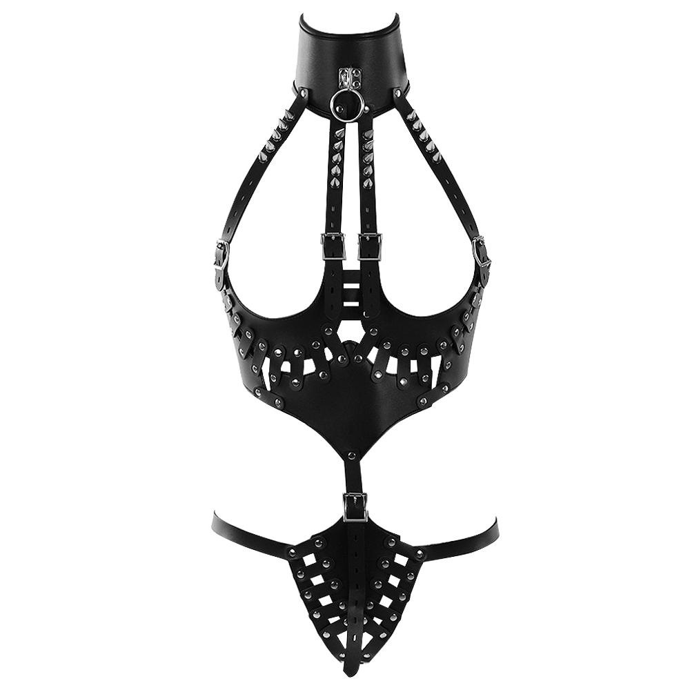 Posture collar, breast harness and thong with exposed crotch, combined in one bondage harness with plenty of adjustable buckles. The decorative studs are anti-nickel treated, to ensure safe play, without allergies.
