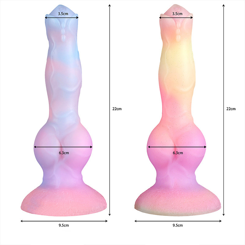 The sounds of howls fill your mind, but you can??t hear them outside. You look around, but nothing else seems to have noticed or stirred after the long, mournful howl. Was it really in your head? Then you hear a growl that seems as close as if a beast were at your neck! The cosmic wolf is across the room, its eyes glowing and star-filled, its tongue lolling as it pants. It paces towards you and you hear the sounds of growling again, but inside your mind, and you realize this colorful, starry wolf is using telepathy to communicate just to you!Function: Dog Lifelike DildoColor: Pink + Yellow/BlueSize: 22 * 6.3 cm/8.66″ * 2.48″Net Weight: 354 g/0.78 lb/12.4 ozPower: NoMaterial: SiliconePackage: OPP bagFurther: non-toxic/Luminous