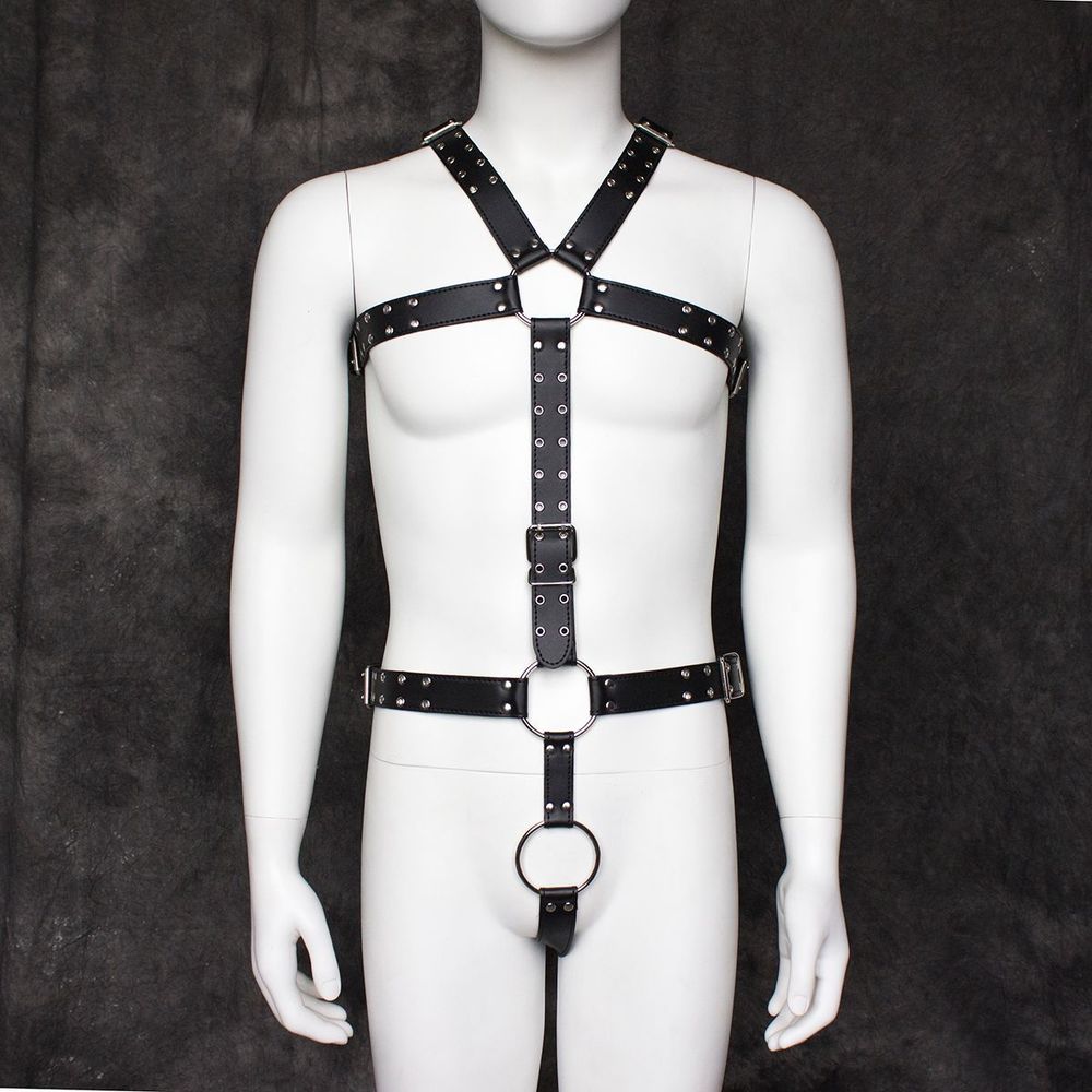 Buckle up faux leather harness, fully adjustable shoulder, chest and waist straps.