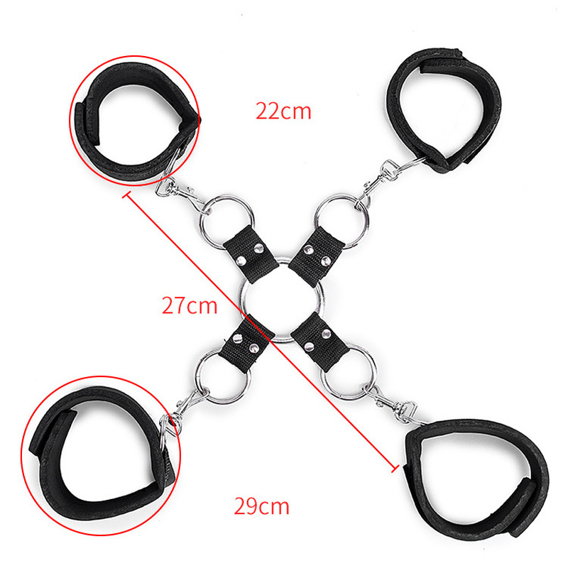 Experiment with new bondage situations with this beginner hog-tie systemGetting out into the world of bondage doesn’t always mean going immediately to the steel and metallic restraints. This effective system includes 4 cuffs, with swivel hooks, and a center connection piece. You can use these items to create an intricate hog-tie setup or use the cuffs to put your partner in a variety of bondage positions. The cuffs are made of a lightweight fabric and are highly adjustable.Beginner Fleece Hog-Tie System Specs and Benefits:Size: Cuffs adjust up to 14 inches in circumference, 2 inches wide, center connector measures 4.75 inches in lengthMaterial: Nylon, fabric, metalColor: BlackContents: 4 cuffs with 4 swivel hooks and 1 center connection piece includedCreate hog-tie positions or use the cuffs to restrain your partner in a variety of ways