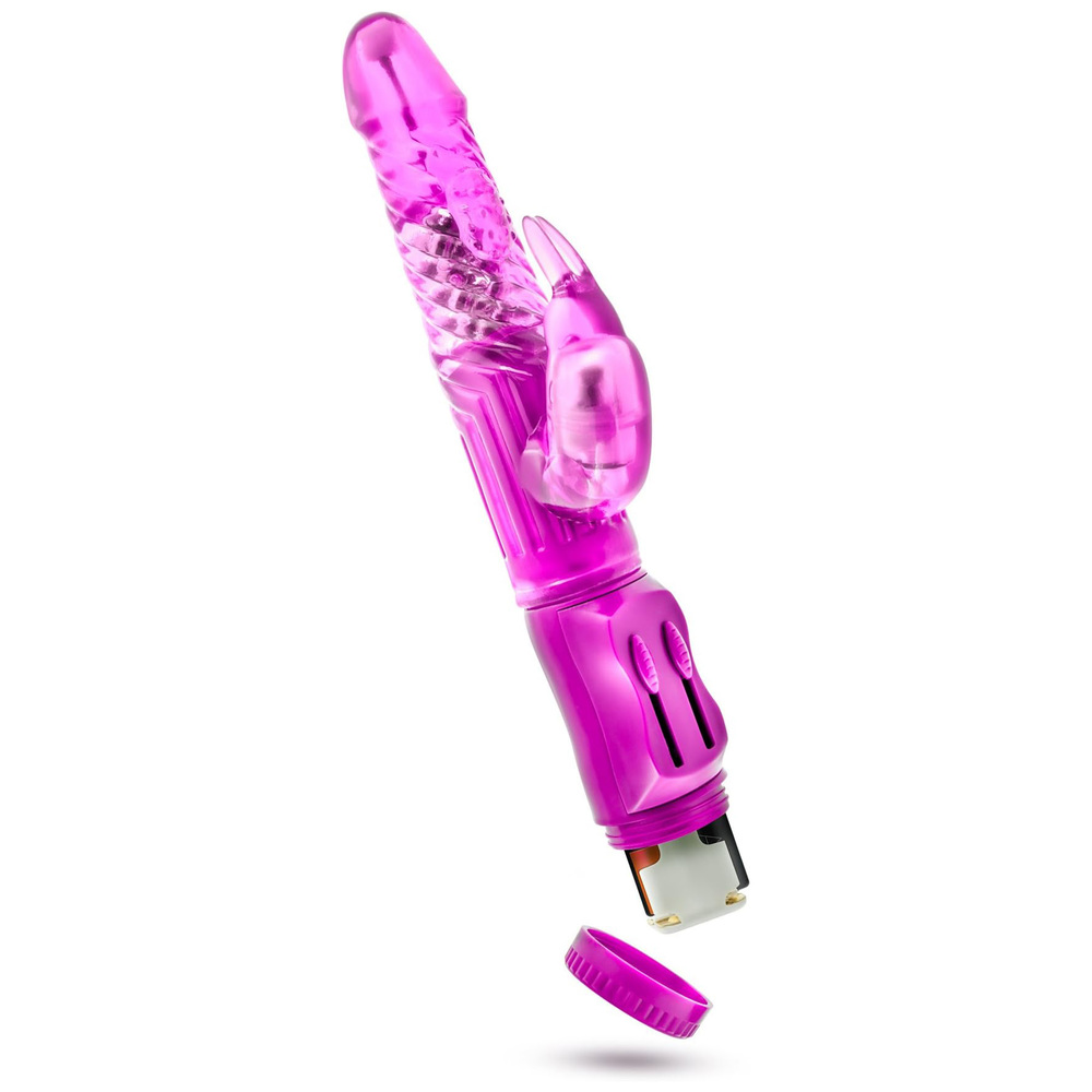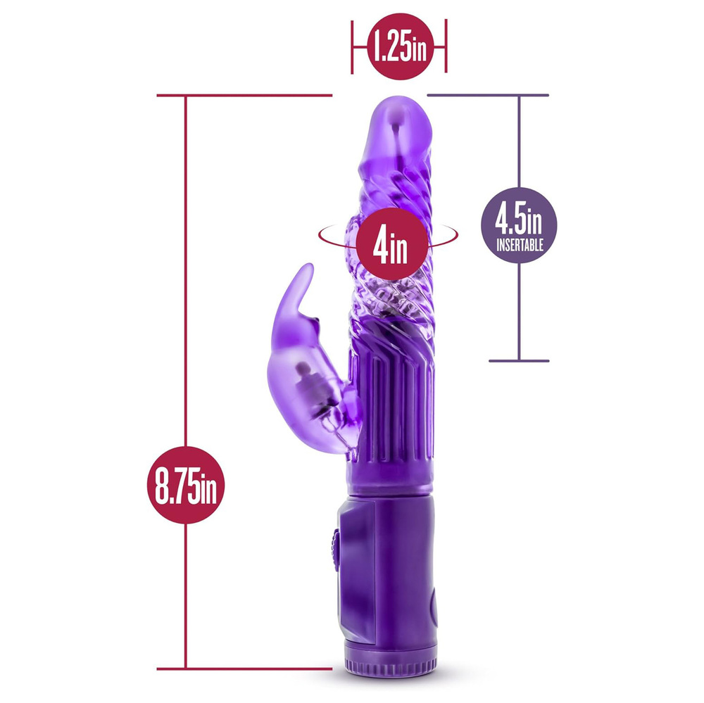 This Beginners Bunny has 4.5 inches of insertable length with a smallish 4 inch girth and a rounded tip making it super easy to insert.?The beads in the shaft rotate and the head gyrates, giving you tons of sensation. A separate bullet in the clitoral bunny is perfectly place to keep contact where you need it most.?Function: 10 Frequency Vibration/Suction/ThrustingColor: Pink/PurpleLength: 8.75 in. (22.225 cm)Insertable length: 4.5 in. (11.43 cm)Width: 1.25 in. (3.17 cm)Net Weight: 236 g/0.52 lb/8.3 ozPower: 3 AAAMaterial: ABS + TPEPackage: Color BoxFurther: Phthalate and latex free.