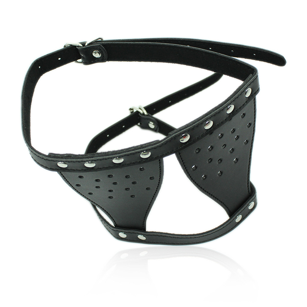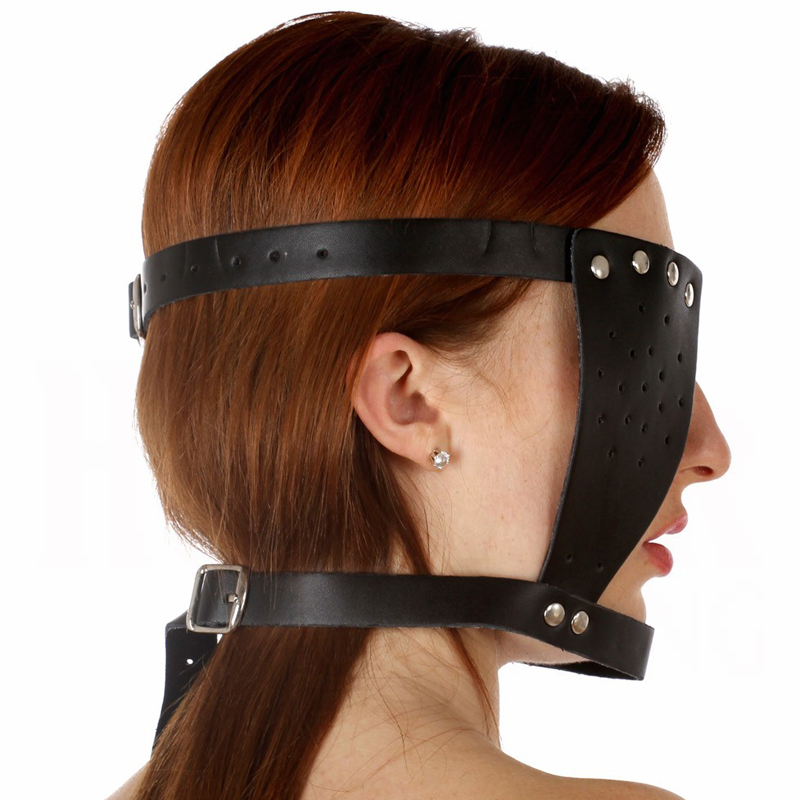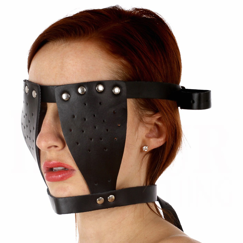 Bondage face and eye harness for facial restriction.