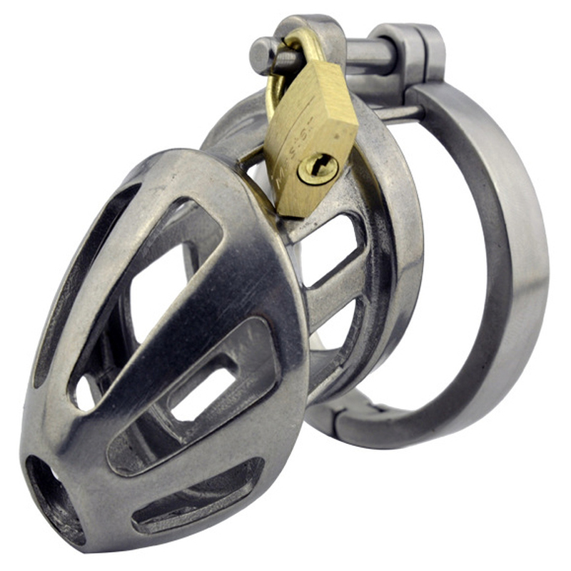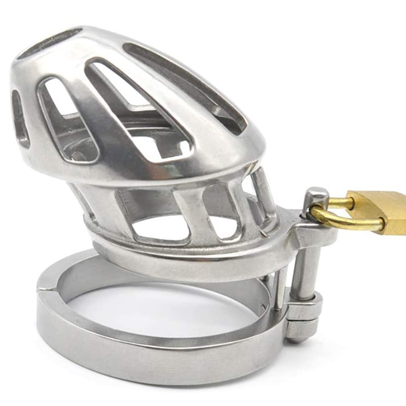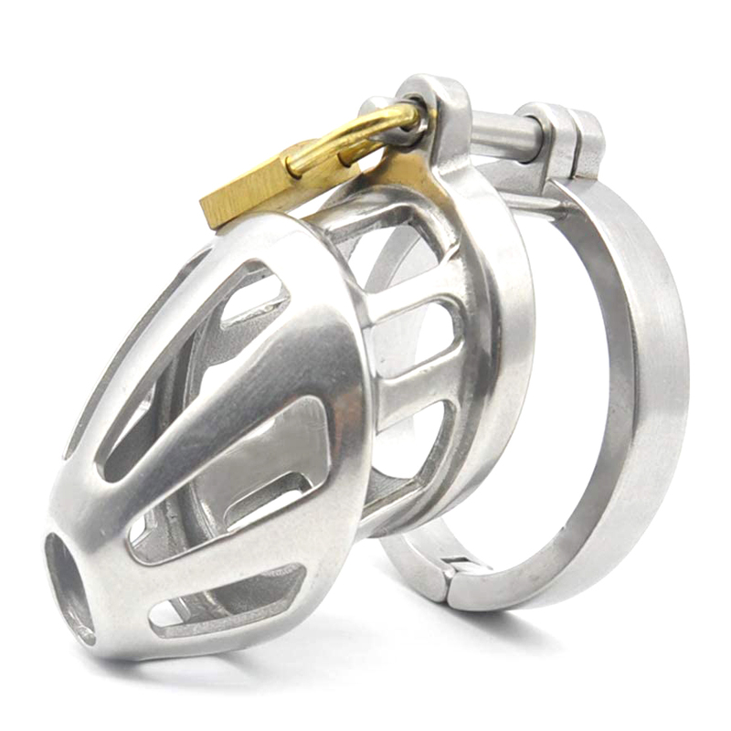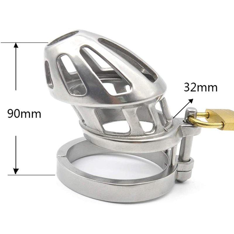 The new, innovative ring design of the?BON4M Stainless Steel Locking Cock Cage Chastity with 4 Cock Ring Sizes?consists of two interlocking pieces that seat into each other. Several ring and pin sizes allow for the perfect fit.A hinged cock ring is the starting point. Insert your choice of locking pin length and place it on behind the balls. That locking pin goes through the middle recessed hole on the base cock ring. The new flat design of the cock rings is extremely comfortable. The rings are included in this kit in 4 sizes (measured by inside diameter): 1.5″, 1 3/4″, 1 7/8″, and 2″ inside diameter.The cage is slipped on over the penis next. The two guide pins attached to the cage portion seat into the base ring and assure the cage won’t be able to rotate on the locking pin. The cage length is 2 1/2″ in length with an inner diameter of 1 1/4″.?The diameter of the ball ring have 3 Size:40 mm/1.6 inch (S)44 mm/1.7 inch (M)48 mm/1.9 inch (L)52 mm/2.0 inch (L)