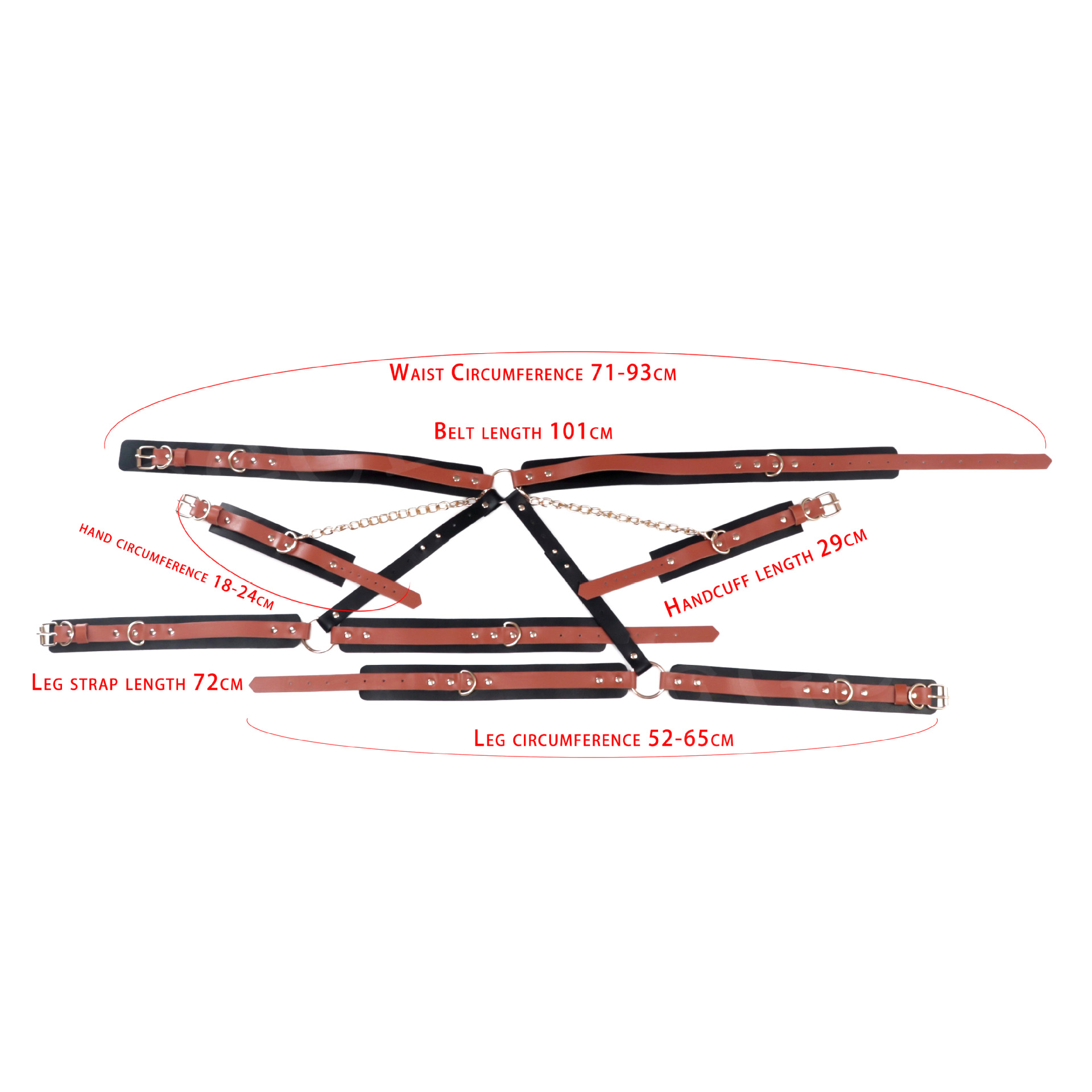 Gothic Bondage Gear Accessories For BDSM LoverMaterial: Faux LeatherColor: Black&BrownWaist: 101.0 cm/39.79 inchWirst: 29.0 cm/11.43 inchThigh: 72.0 cm/28.37 inchPackage: OPP Bag