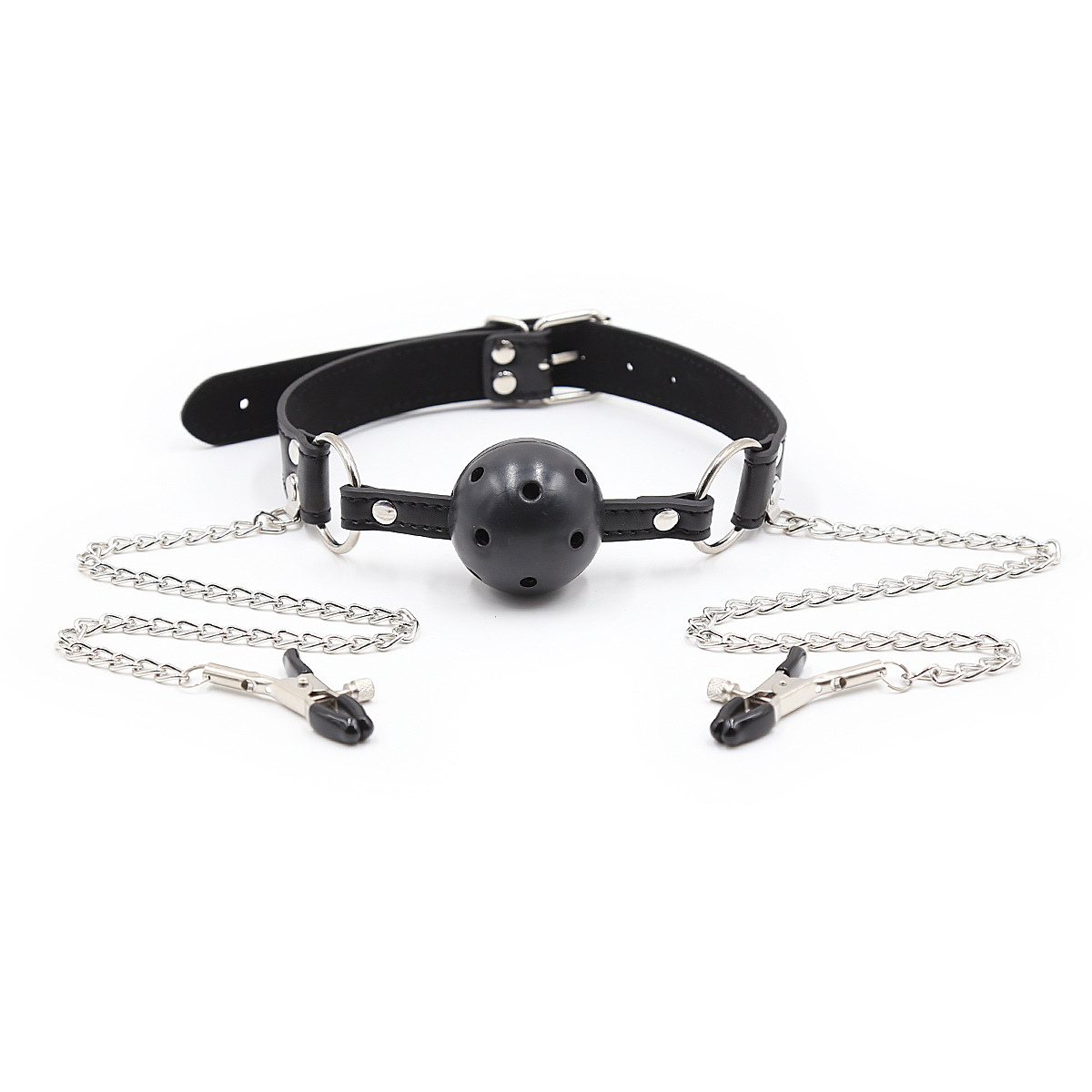 Adorn your sub in an exquisite device that puts them comfortably under your will. This ball gag is two inches in diameter, making it perfect for prying your partner’s mouth open and keeping them quiet. The many holes allow for unhindered breathing to make it more comfortable for the wearer, as well as allow you to hear all of their moans and groans. The attached alligator clamps are adjustable, to be tightened according to your combined desires. The leather strap secures up to 23 inches in circumference.