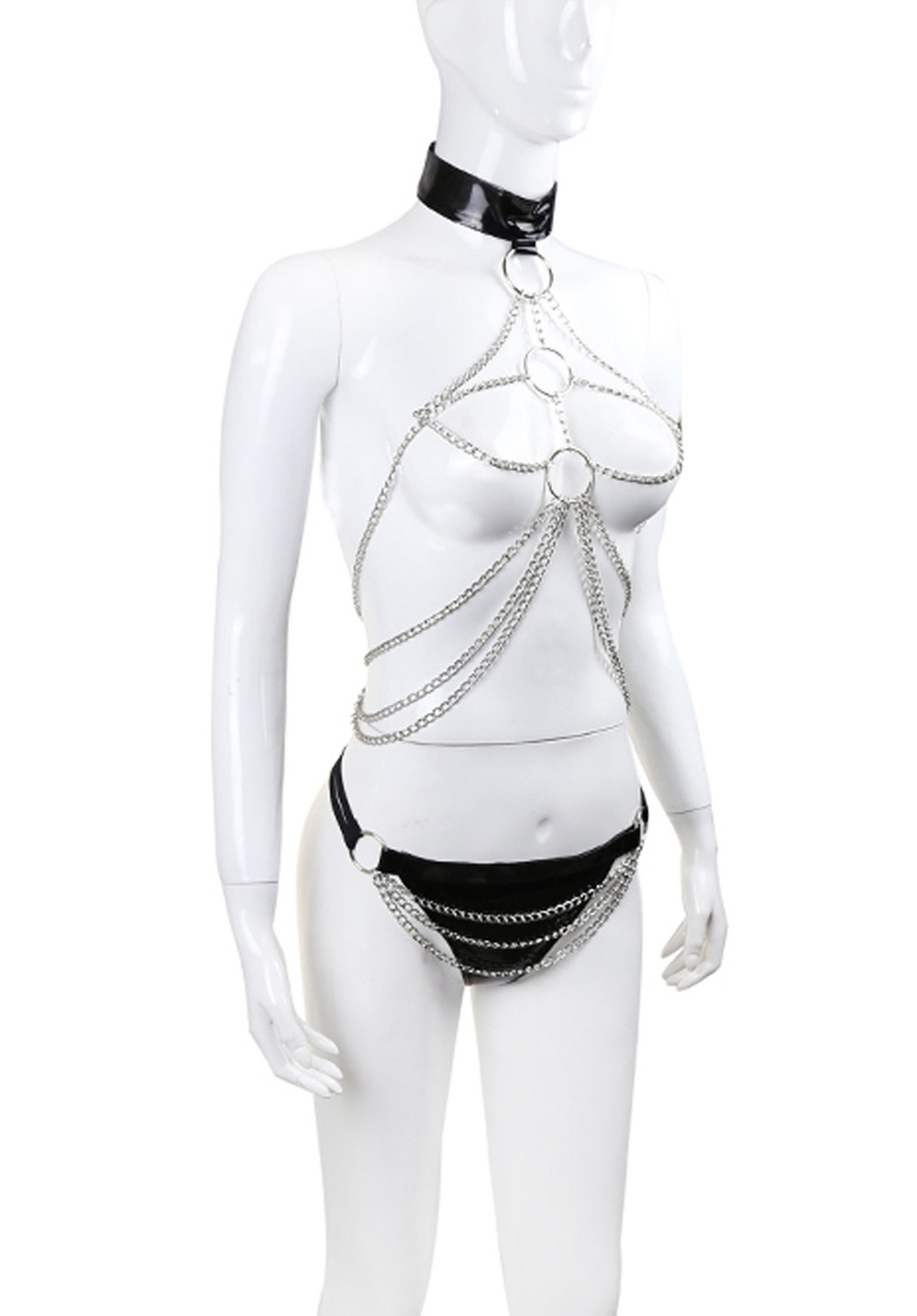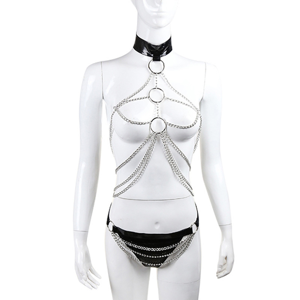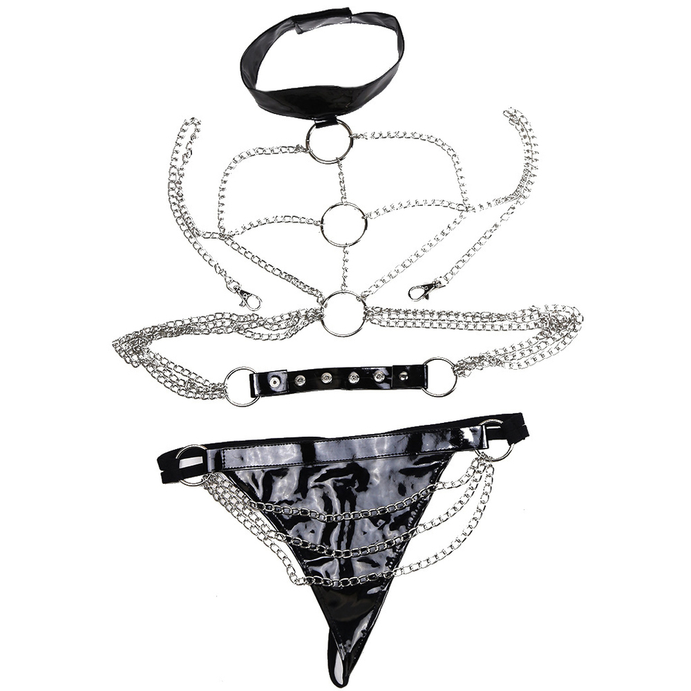 This chain harness set includes an open body chain and faux leather panty.