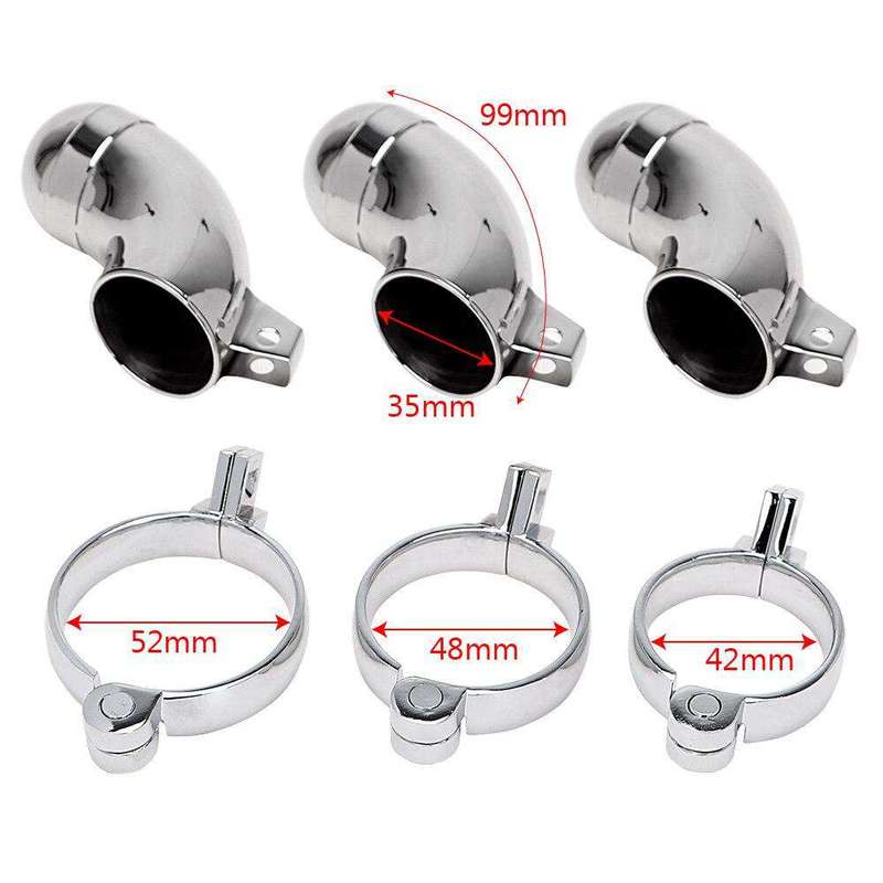 Chrome-Plated Chastity Tube with Cock Tubing Cover Removable (with 2 pcs renewable covers)Love the look of metal? Then this chrome tube is just what you need for restricting your man. When combined with the chastity cage rings, you have a way to keep your man??s cock locked in tight and secure. Just place your man??s flaccid penis into the cage and use the ring and padlock to lock him in tight. As you tease and please him, the tube will restrict his erection.The cock tubing cover is removable, open tubing that allows his cock to poke through and be seen, close ended tubing that completely closes off his penis.The open tube measures 4.25″ in length and 5″ in circumference (1.5″ in width). The closed tube measures 5.25″ in length and 5″ in circumference (1.5″ in width).The Chrome-Plated Chastity Tube comes with 2 steel locking cock rings to ensure that your chastity device fits well: small (40mm in diameter), and large (45 mm in diameter), both available.The diameter of the ball ring have 3 Size:40 mm/1.6 inch (S)45 mm/1.8 inch (M)50 mm/2.0 inch (L)