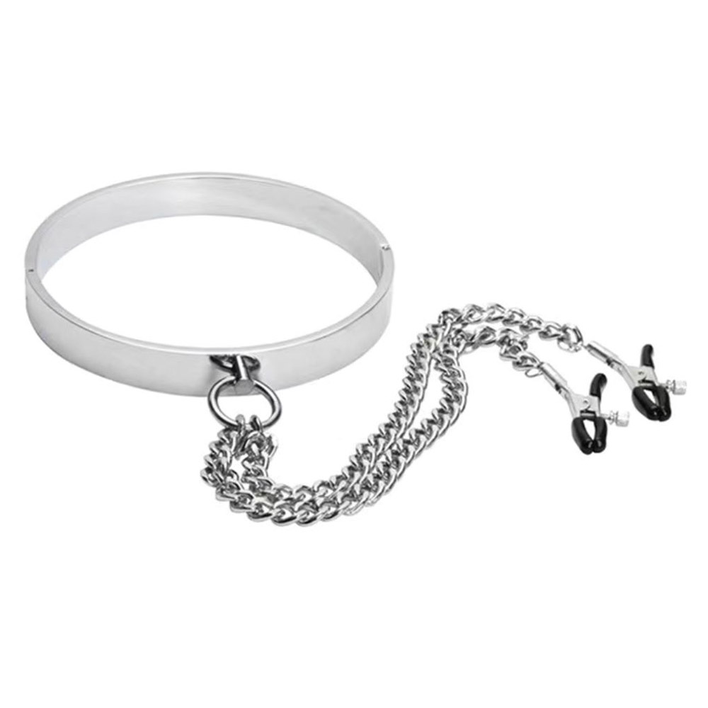 Combine the tactile pleasure of arousing nipple play with the erotic thrill of domination and control using this Collar to Nipple Clamp Set. By sliding the locking pin into the gleaming hinged collar you can have your partner on total lock down. A magnetic strip on the locking mechanism holds the pin flush against the collar, without the bulk of a traditional padlock, so your partner can only be released when you are ready. The shiny 11.5″ chains connect your partner’s throat to one of their most arousing sexual areas. The twist down adjustable screws let you tighten or loosen the pressure on the nipple clamps for as much sweet sensual discipline as you want to apply.