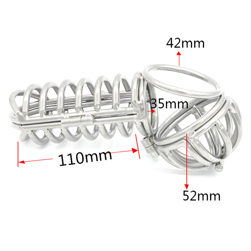 The entire cage is 6.5″ in length, including the ball cage. The diameter of the cock and ball ring is just under 2″ and the ball cage itself is 2″ in diameter also. The diameter of the penis cage itself is 1 3/8″ for a tight, restricting experience.