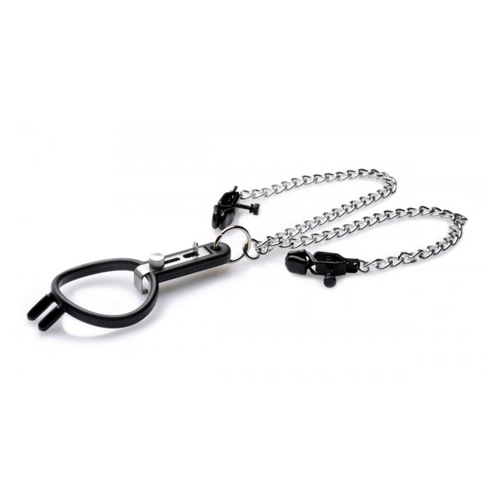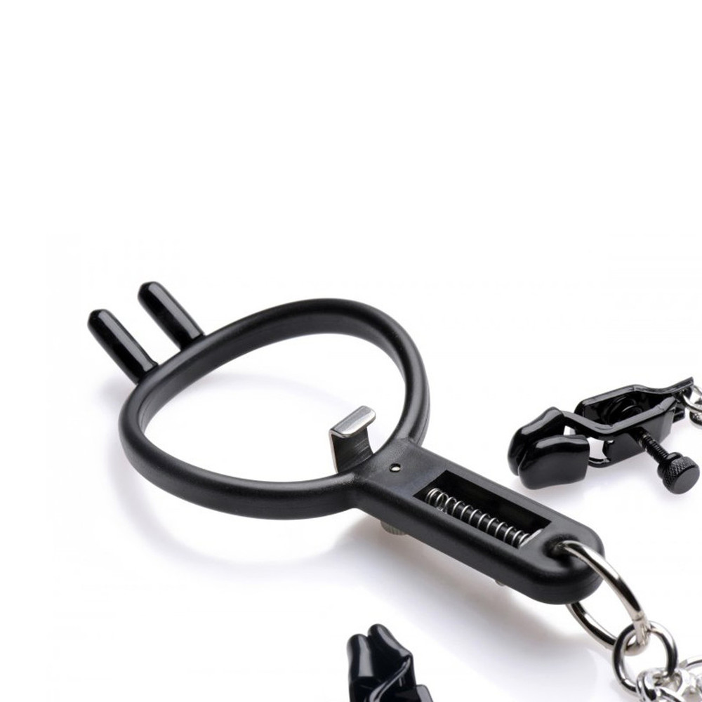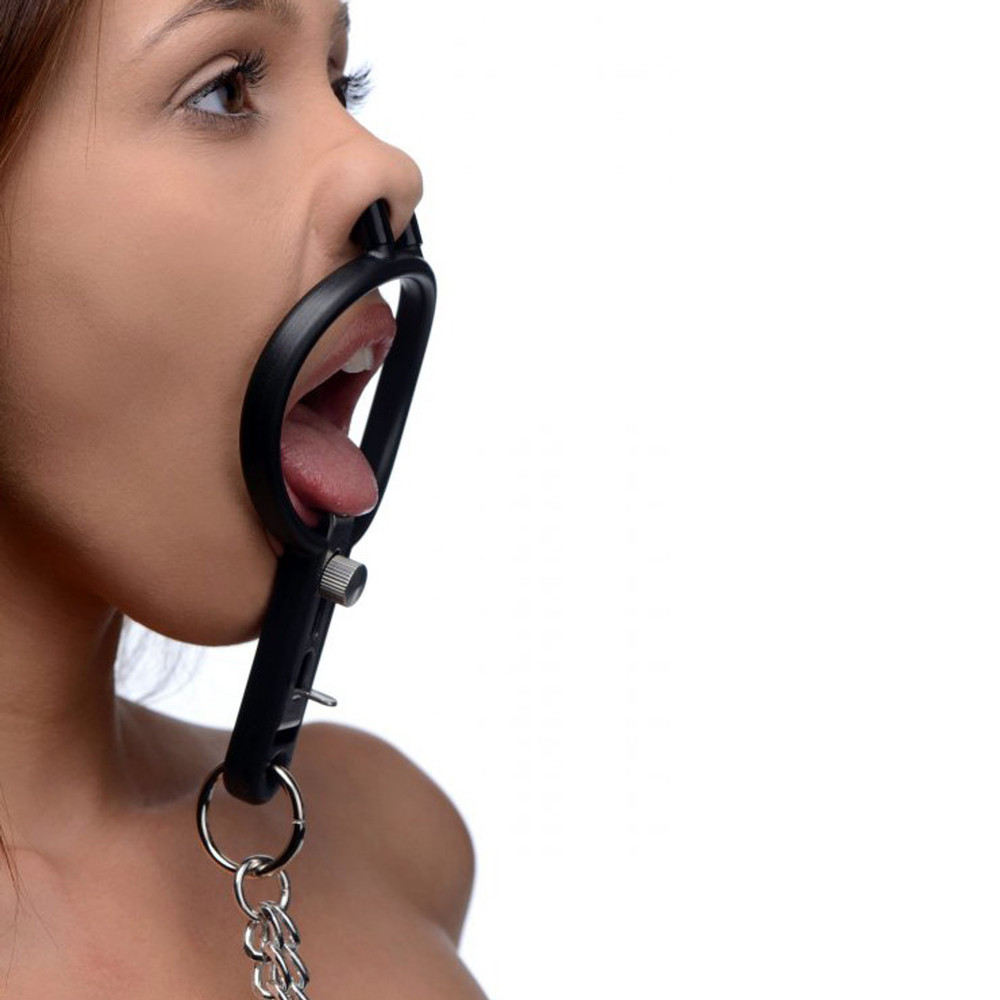 Humiliate your plaything with a device that pulls their nose up like a piggy, forces their mouth open, and pinches their nipples! The Degrader does exactly as its name suggests, prying their mouth open with a pair of plugs that finds leverage in their nose and an adjustable spreader that tugs down on their bottom lip! Lightweight chains lead down to a set of sadistic vinyl-tipped clamps. These vicious nipple clamps are also adjustable in tightness using a similar spring system controlled by screw knobs. Take your play scene to a new level with this twisted BDSM accessory!?