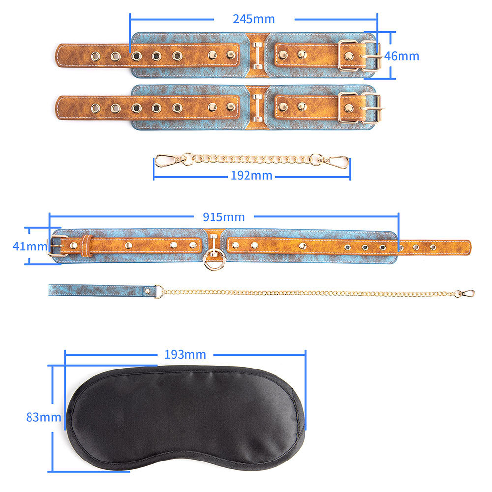 Material: PUColor: Brown + BlueBlindfold Size: 19.3 * 8.3 cm/7.6 * 3.3 inchWrist Size: 24.5 * 4.6 cm/9.6 * 1.8 inchCollar Size: 91.5 * 4.1 cm/36 * 1.6 inchLeash Size: 90 cm/35.4 inchPackage: OPP Bag