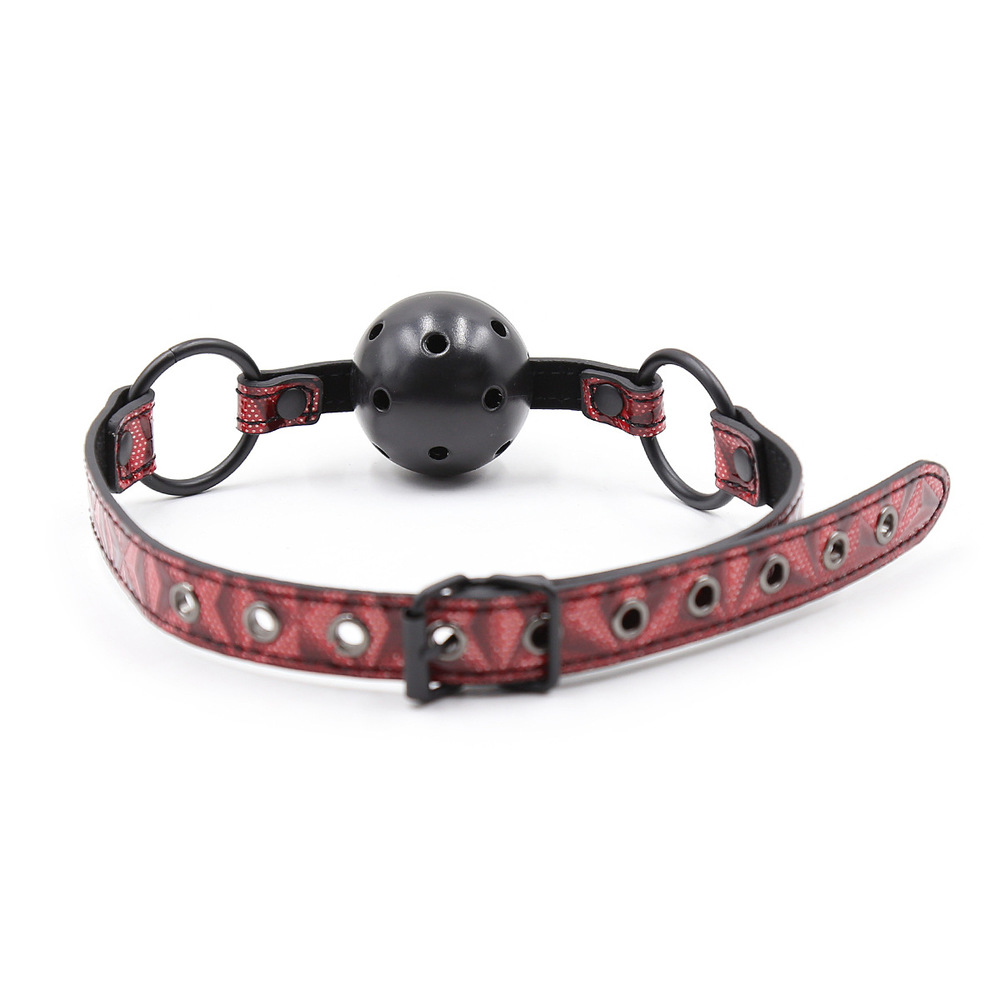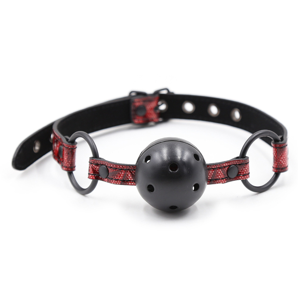 The ultra firm, perfectly perforated ABS plastic ball is 5 3/4 inches around, definitely a mouthful, and the shiny vinyl strap has lots of room for adjustment. Nickel free.