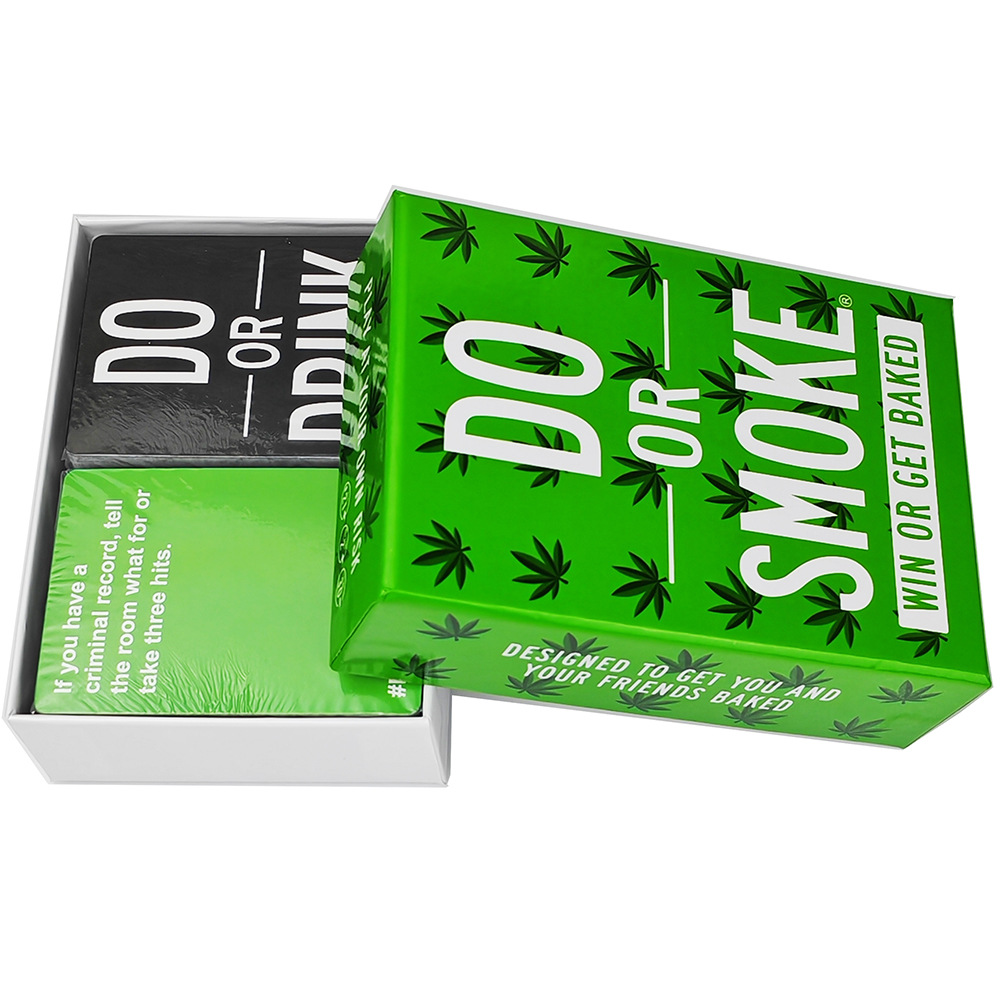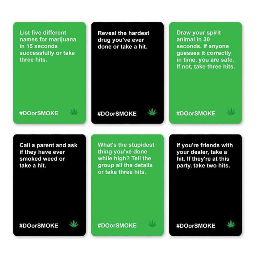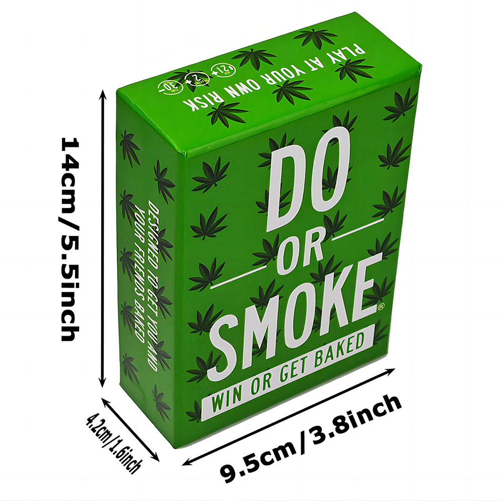 Made By Stoners For Stoners ?C We took our Stoner Theme Pack and turned things up a notch with 250 cards to get you higher. Each player will get a chance to complete a challenge or smoke their way out Easy to Play ?C Shuffle and pull a card from the deck, read and do the challenge on the card or smoke the amount listed?? You may get lucky with a memory, vote, guessing, versus card, or others Great Stoner Gift for 420 and Game Night ?C This adult game makes a great gift for any stoner you know. Perfect for any gathering where you know you??ll be smokin?? Never Have Another Boring Smoke Sesh ?C Our adult party games are designed to keep the party going with hilarious moments. Bring Do or Smoke and keep your guests from zoning out on their phones?? Our Promise ?C Have a blast through our card game for stoners! Got issues with your order? Tell us & we??ll make it right.