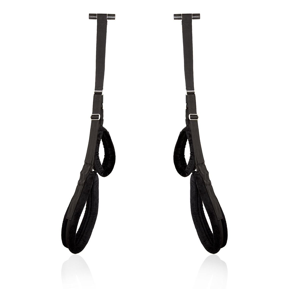 Two firm plastic stoppers ft over top of the door, holding tight once it’s closed- always set up the Door Slam on the ‘in’ side to avoid any accidents caused by the door swinging open during exploits. Once in place, two soft, padded thigh cuffs cushion, lift and spread the legs while adjustable handles provide a stable grip. All straps are fully adjustable, allowing mates to configure a perfect position situation. Holds up to 250lbs (113.4kg). Fits most standard doors.