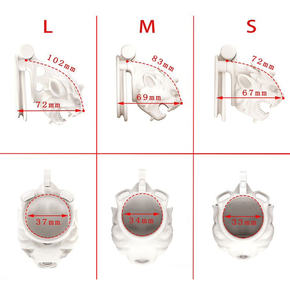The chastity cage adopts advanced 3D stereoscopic printing technology to design the cage into the shape of a Dragon head with a small bell, which is unique and complicated. The Dragon represents might and ferocity, wearing it can show the male dominance.Material: NylonColor: Pink/WhiteCock Size:S: 7.2 * 3.3 cm /2.84 * 1.30 inchM: 8.3 * 3.4 cm /3.27 * 1.34 inchL: 10.2 * 3.7 cm /4.02 * 1.46 inchRing Dia:3.8 cm /1.50 inch4.3 cm /1.69 inch4.8 cm /1.89 inch5.2 cm /2.05 inchPackage: OPP BagPackaging List:1 * Chastity Cage4 * Rings1 * Lock with 2 Keys