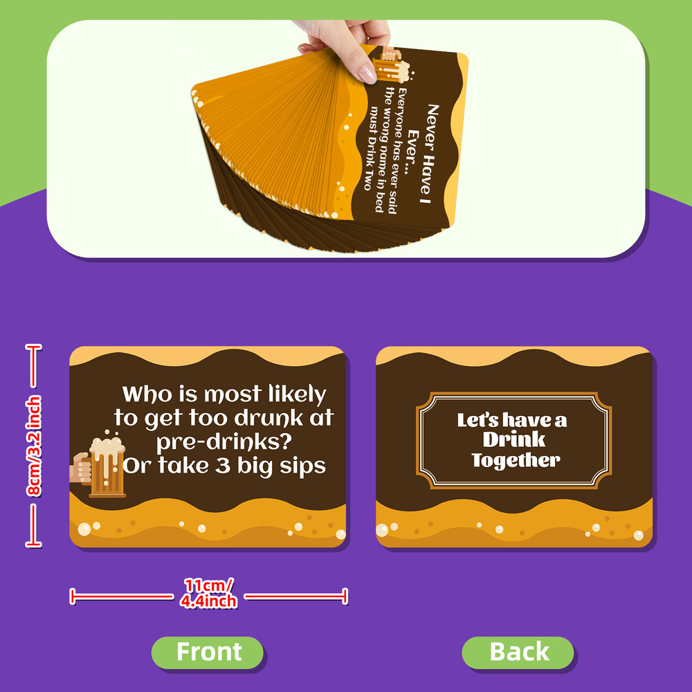 Spice up your relationship with this relationship enhancing set of 50 interactive cards for couples! Perfect for date nights, camping trips, hotel stays and even parties, these ambiguous and fun cards will spark engaging conversations and fun activities between you and your partner.Our interactive card set for couples is durable, colourful and fun. It is perfect for couples of any age. Each card presents an open-ended prompt or challenge that allows you to explore new aspects of your relationship in a fun and interactive way.With 50 unique cards, you’ll never run out of fresh ideas to keep the spark alive.Whether you want to deepen your connection, rekindle the romance, or simply enjoy quality time together, this set of cards is a great addition to your couples’ toolkit.Small and portable, you can take the fun anywhere – from the great outdoors to a cosy night in. Ignite your curiosity, enhance intimacy, and create lasting memories with this relationship-boosting set of 50 interactive cards for couples.Size: 11.0 * 8.0 cm/4.33 * 3.15 inch