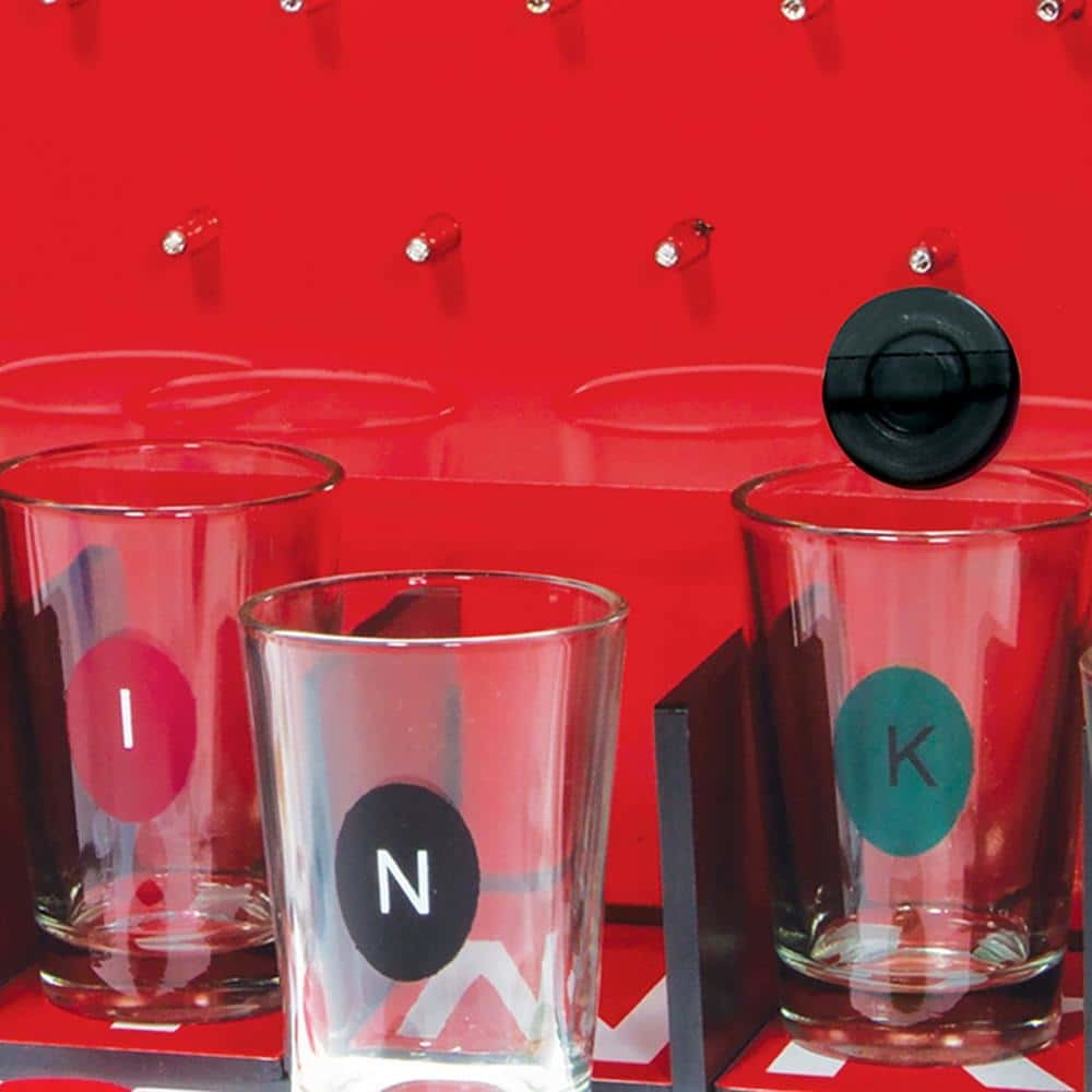 Drinko Shot Game show classic is the perfect way to liven up any party or festivity, with or without alcohol! Drinko is a great drinking game of chance and luck, where everyone ends up being a winner!Fill shot glasses with drink of choice. Set them to the side and do not place them back on the board. Each shot glass is labeled to correspond with a slot on the board (d ?C r ?C I ?C n ?C k ?C o).The youngest player goes first. This first player takes a chip and drops it into the top of the Drinko board. The chip will fall and land into a lettered compartment.Drink the contents of the corresponding lettered glass. Refill the glass and it??s now next player??s turn.Each Drinko set includes 6 shot glasses, 6 coloured ships, and a playing board with acrylic cover.