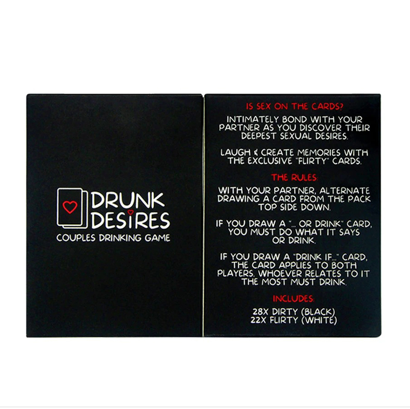Drunk Desires is the perfect couples drinking game. This game has been designed to increase the intimacy between you and your partner. With 50 exciting, flirtatious & daring cards, this will be a night to remember.