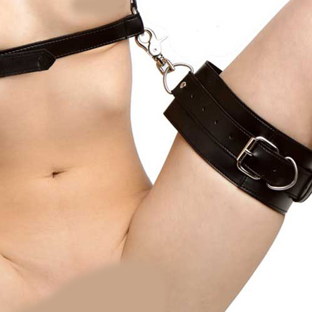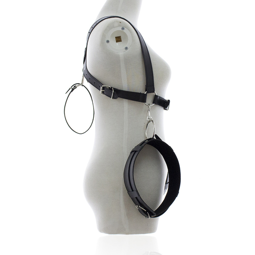 Even though the materials in this restraint system are cruelty free, that does not mean your play has to be. Made of high quality vegan leather, this piece still offers the luxurious feel and texture of animal leather. The sturdy straps fit over the chest, coming together in the back in an X shape, which supports the wrist cuff assembly. The front strap runs under the breasts, and supports two sturdy metal D-rings, which the thigh cuffs attach to. This sinister piece is durable, strong, and made from quality materials. Each strap is adjustable for the perfect fit. The chest piece alone offers three separate points of adjustability, so you can be sure your subject has no way to escape. They will be spread open wide and at your mercy. You decide when release comes.?