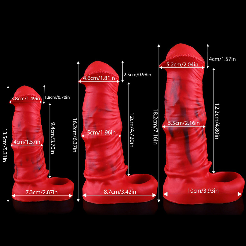 This Fantasy Horse Penis Sheath is ready to please you and your partner with memorable experiences for both wearer and receiver.Whether it??s the tantalizing, subtle internal texture for the wearer, or the gentle, girthy shaft that excites the lucky receiver of this Fantasy Horse Penis Sheath.Function: Penis SleeveColor: Red + BlackSize:S: 13.5 * 4.0 cm /5.32 * 1.58 inch (85 g/0.19 lb/3.00 oz)M: 16.2 * 5.0 cm /6.38 * 1.97 inch (160 g/0.35 lb/5.64 oz)L: 18.2 * 5.5 cm /7.17 * 2.17 inch (220 g/0.48 lb/7.76 oz)Insert Size:S: 9.4 cm /3.70 inchM: 12.0 cm /4.73 inchL: 12.2 cm /4.81 inchPower: NoMaterial: SiliconePackage: OPP BagFurther: Washable/Soft