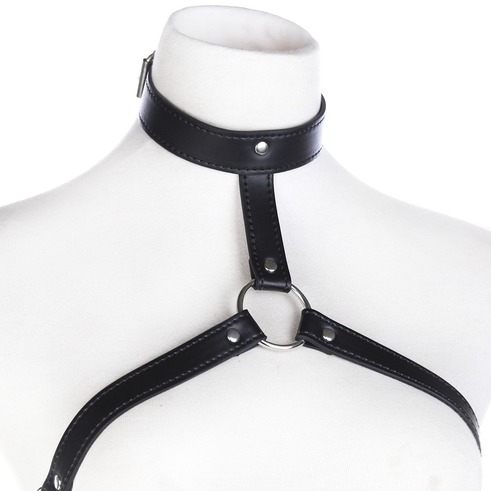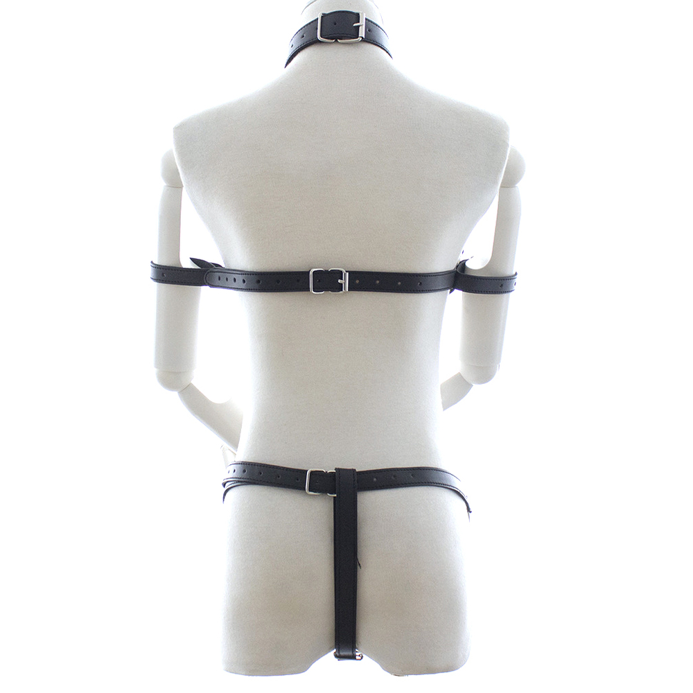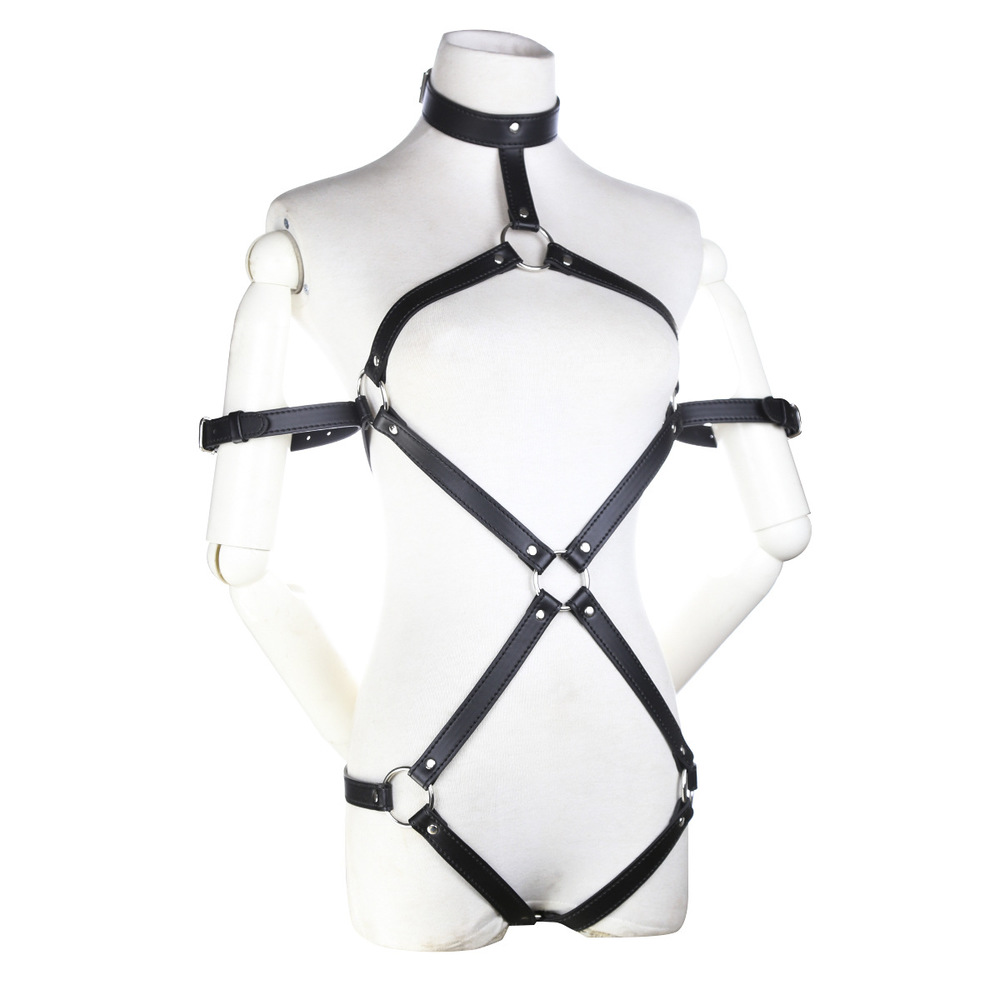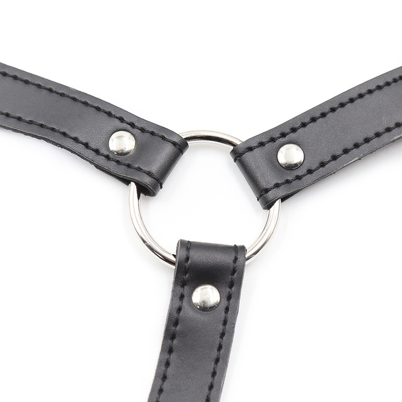 The Leather Body Harness Teddy adorned with 7pcs metal rings, snaps and rivets and 5 pcs buckles for fanstening.