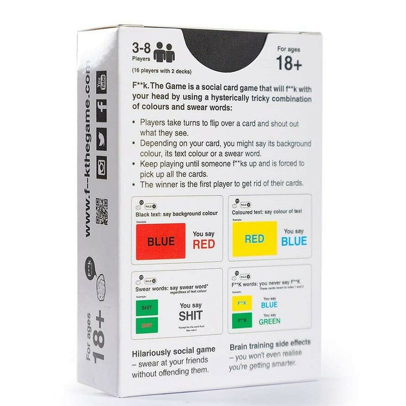 A card game perfect for the next night in with your mates. A social card game that will fuck with your head by using a hysterically tricky combination of colours and swear words. It sounds simple, but the cards use a psychological phenomenon ?C the Stroop effect ?C known to mess with your head and delay your brain??s response. Players can??t help but f**k up, sending the group into fits of laughter. Once you??ve mastered the basics, you can take the game to a whole new level with more rules, more strategy and you can even create your own rules. Hilariously social game ?C swear at your friends without offending them. Brain training side effects ?C you won??t even realise you??re getting smarter. Laugh at other people??s mistakes ?C even your smartest friends are bound to f**k up. Therapeutic benefits ?C let off steam by innocently shouting profanities. Perfect pub size ?C pocket friendly size making it perfect to take to pubs and parties. (please note the size.. it is pocket size.. not board size)