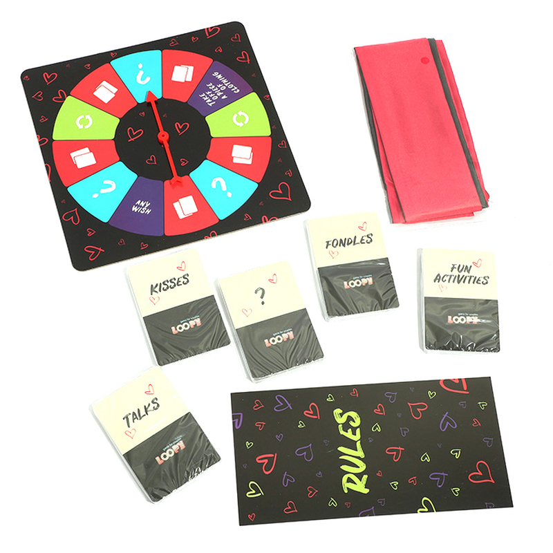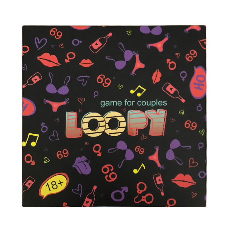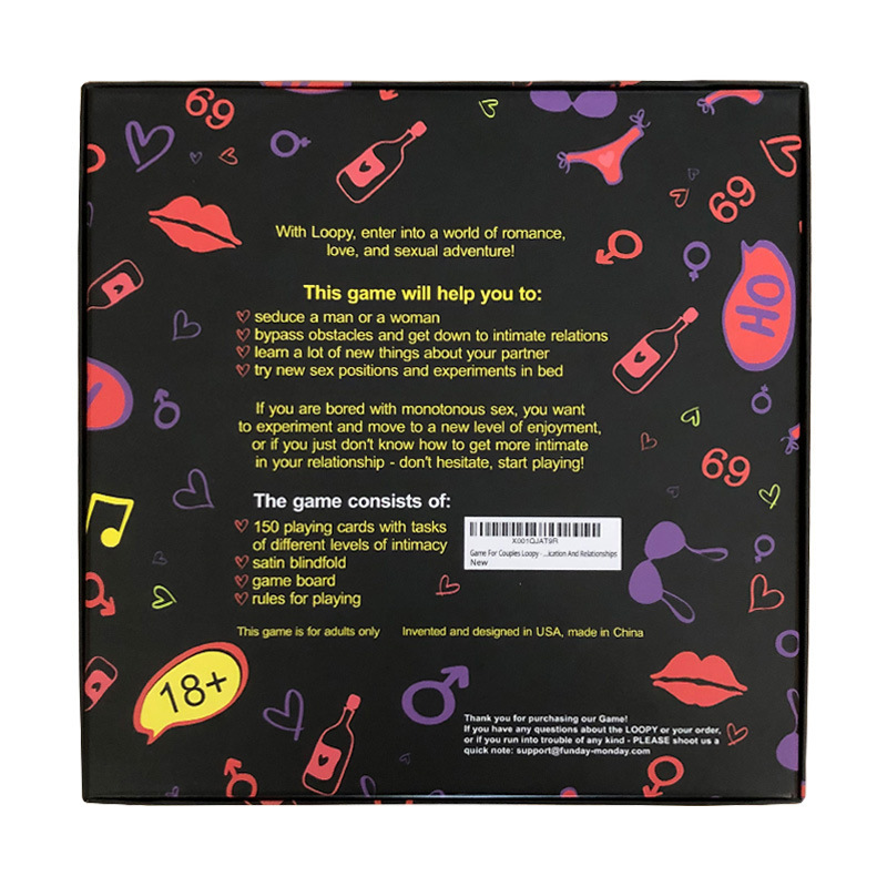 COUPLES BOARD GAME – The Loopy game will make tonight different from all the other nights. This game will have both of you learning, laughing, and loving each other 150 PLAYING CARDS – Set includes cards with playing board and all necessary instructions. Just spin the arrow, choose the card, and let the game begin. Moreover, you will get one incredible bonus ?C satin blindfold, which definitely will not let you get bored STRENGTHEN YOUR CONNECTION – The best opportunity to know each other better and to enjoy new impression: provoking questions and creative tasks that allow you to discover the soul and the body of your partner SPICE UP YOUR RELATIONSHIP – This game will add some heat and vivid emotions to the life of your pair, fire up new desires and show you unusual ways to please and be pleased A PERFECT GIFT FOR ANY COUPLE – This board game might bring the two of you closer than ever before. Perhaps, you will discover something about yourself you never knew! Funny romantic therapy game Spice Up Your RelationshipnTired of boring evenings in front of the TV, do not know how to spend your evening with your loved ones? Board game does not sound very exciting, ha? Then you do not have the right sort of board gamesnAnd so here comes couples game LoopynLoopy really comes in handy in different situations, such as nights at home when the power is out, or when you just want to throw in a bit of levity and excitement into your relationship.n So set the mood in your house with some music, perhaps light a few candles and open up the box to begin.nSurprise your loved one with our couples board game and make some brand new memories togethernnThis game is great for creating emotional and physical contact, awaking all 5 senses and spicing up your relationship. Using the gaming form, it is really easy to open yourself for a man, as well as a woman.nThis couples game offers you new love experiences, unlocks all your complexes and doubts and opens your mind to the relationship of the highest levelnnnQuick Rules OverviewnThe game set consists of the game board with an arrow, 150 cards, rules and a blindfold.n You can choose how far you are willing to go by selecting the appropriate level. There are four of them: TALKS, KISSES, FONDLES, FUN ACTIVITIES and a special bonus deck. You can always level up if feel like doing itnLuxury silk strip is included for reaching new edges of emotions. Get blindfolded and trust your inner feelings. Or tie your partners hands, right now you have control over him or hernnIn addition, you will be totally pleased with our creative design, different themes of playing cards and high-quality material of all componentsnnYou will like it, even if you lose. So click add to cart right now and start this intriguing adventure with your loved onesDear customers, this is a new improved version of LOOPY. We have made it better thanks to your advice