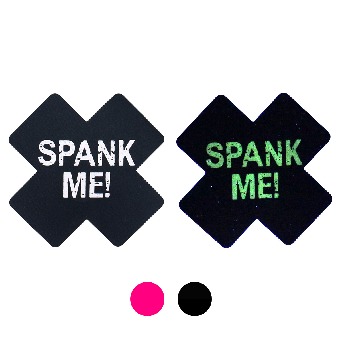 X or cross shaped fabric pasties nipple sticker with Luminous??SPANK ME!?? graphic.Function: Sexy adhesive luminous nipple protectorsColor: Black/RoseSize: 7.8 cm /3.07 inchMaterial: SatinPackage: OPP BagFurther: Self-adhesive/Disposable/Luminous