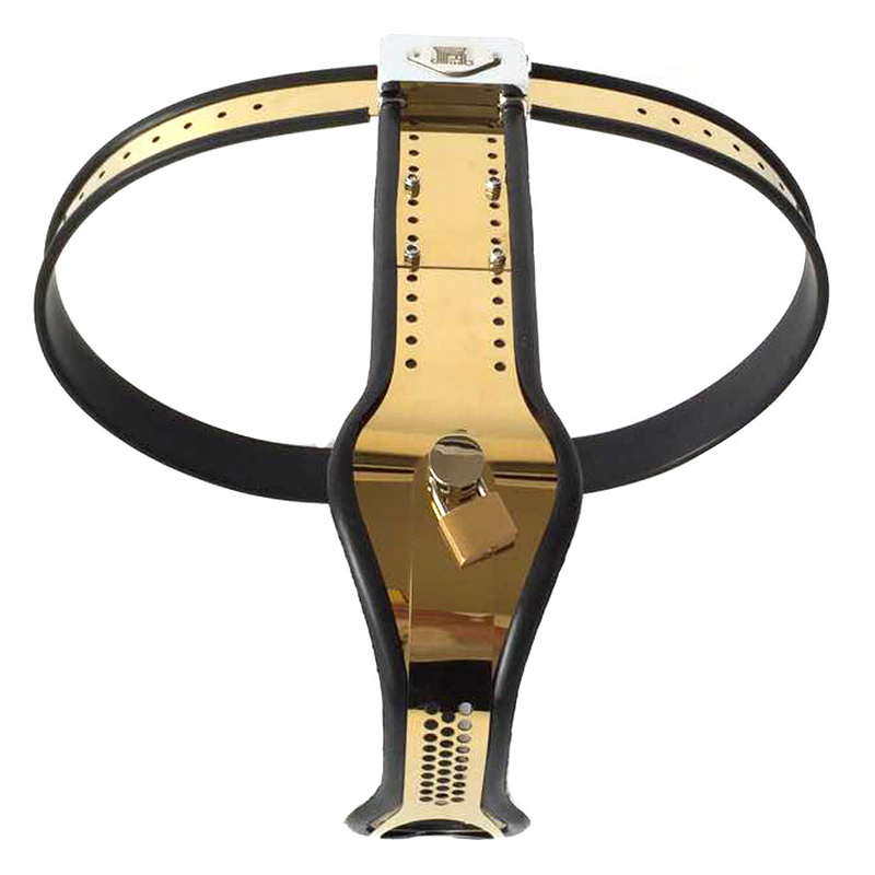 Female chastity belt with widely adjustable waist band and crotch band.