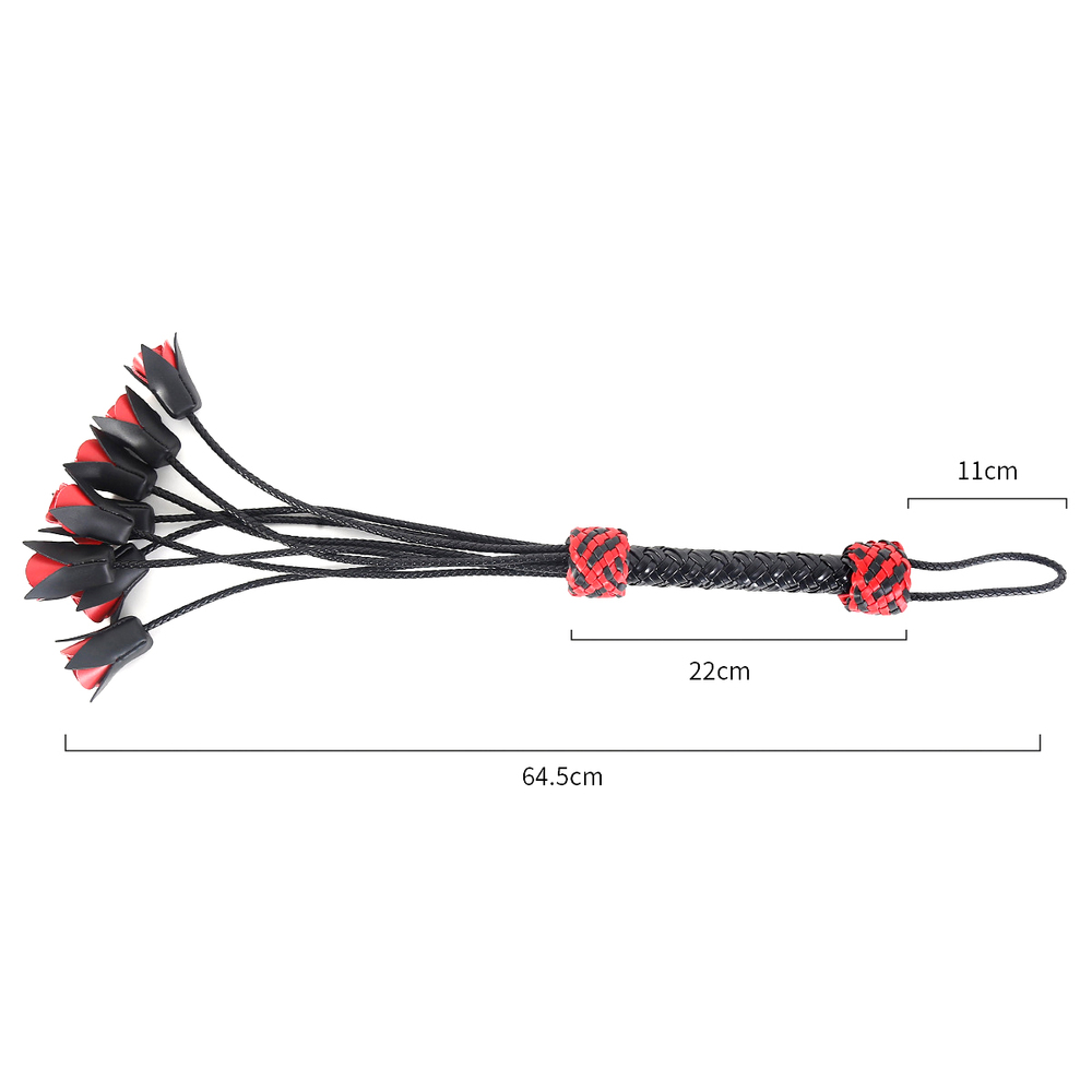 The whip consists of 8 roses, all hand-woven.The whip horse lash is of superior length and thickness for light tickles and sharp lashes.When you hold faux whip, you feel the power, and it’s up to your mood how to use this tool.Material: Faux LeatherColor: Black + RedLength: 64.5 cm/25.41 inchHandle: 22 cm/8.67 inchPackage: OPP Bag