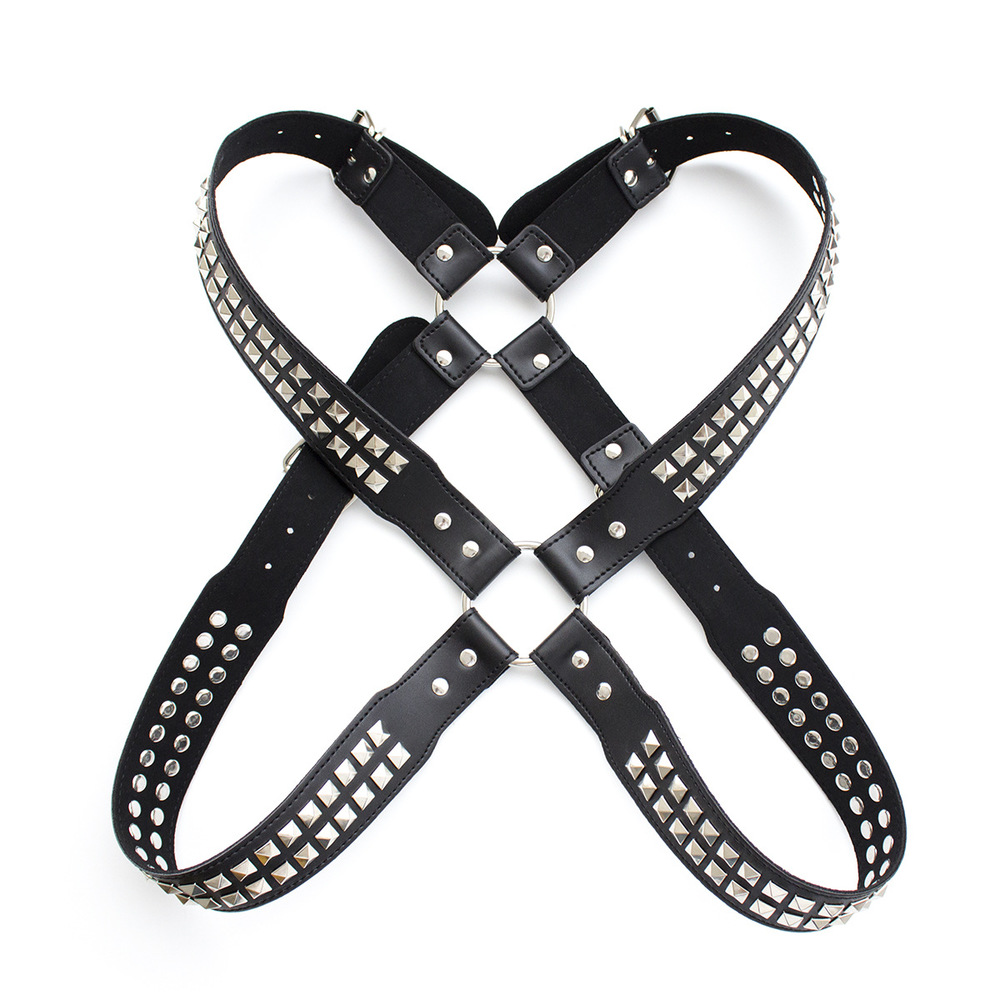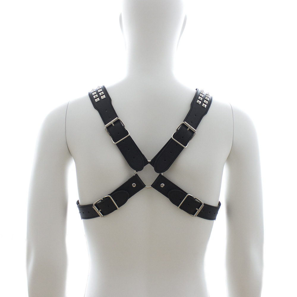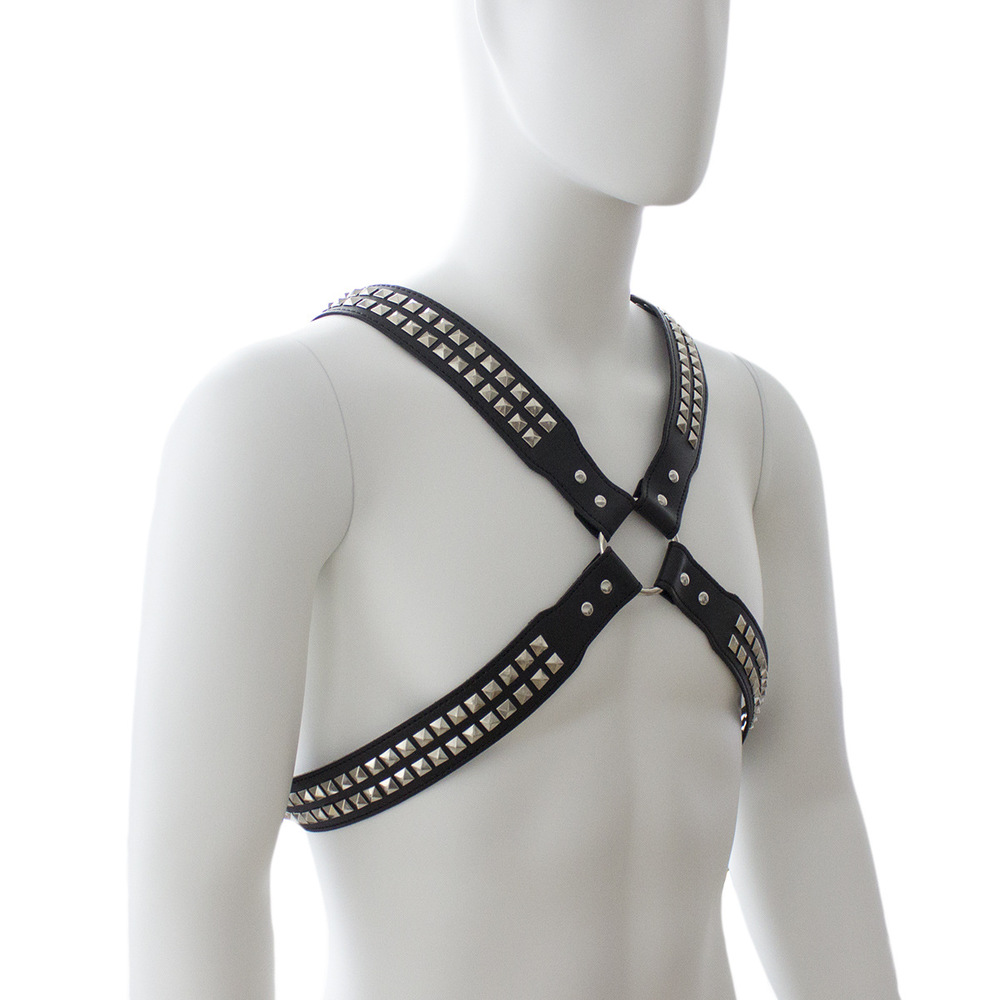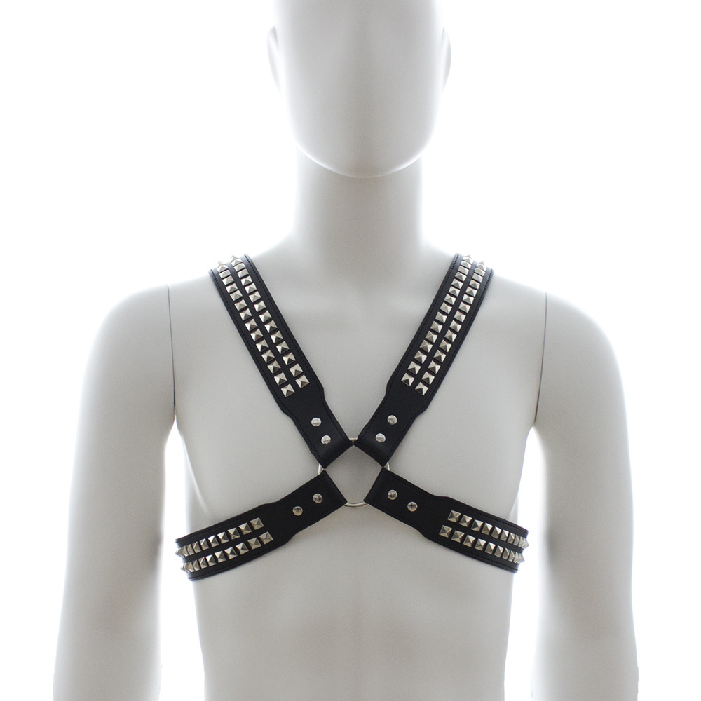 Black leather harness with two rows of shiny pyramid studs on each flap. This harness is available in sizes X Small, Small, Medium, Large and Extra Large.