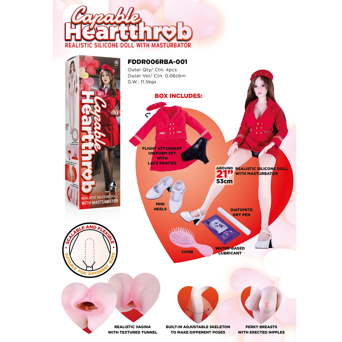 Hearthrob 21″ Realistic Silicone Sex Doll – Flight Attendant,a lifelike adult companion doll with vaginal masturbation made from high-quality, medical-grade silicone.Material:Silicone+PolyesterHieght:53cm/ 21 inchesPacking List:1xSex Doll With Wig1xComb1xFlight Attendant Costume With Panty1xReal Leather ShoesWeight:11.5kg
