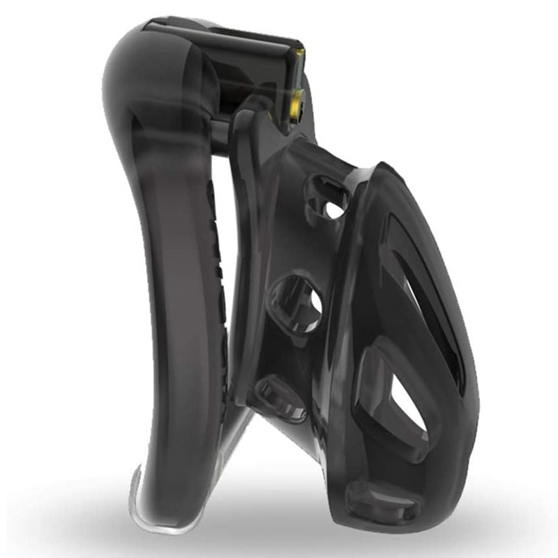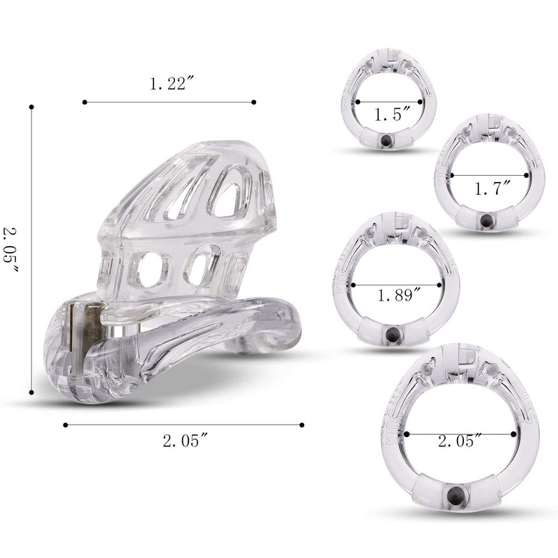Material: ABSColor: Black/ClearSize: 6.2 * 3.1 cm/2.4 * 1.2 inchS Cage Length: 3.8 cm/1.5 inchM Cage Length: 5.2 cm/2.04 inch4 ring sizes – Ring Size: 4.0 cm/1.6 inch? 4.3 cm/1.7 inch 4.8 cm/1.9 inch 5.2 cm/2.0 inchPackage: OPP Bag