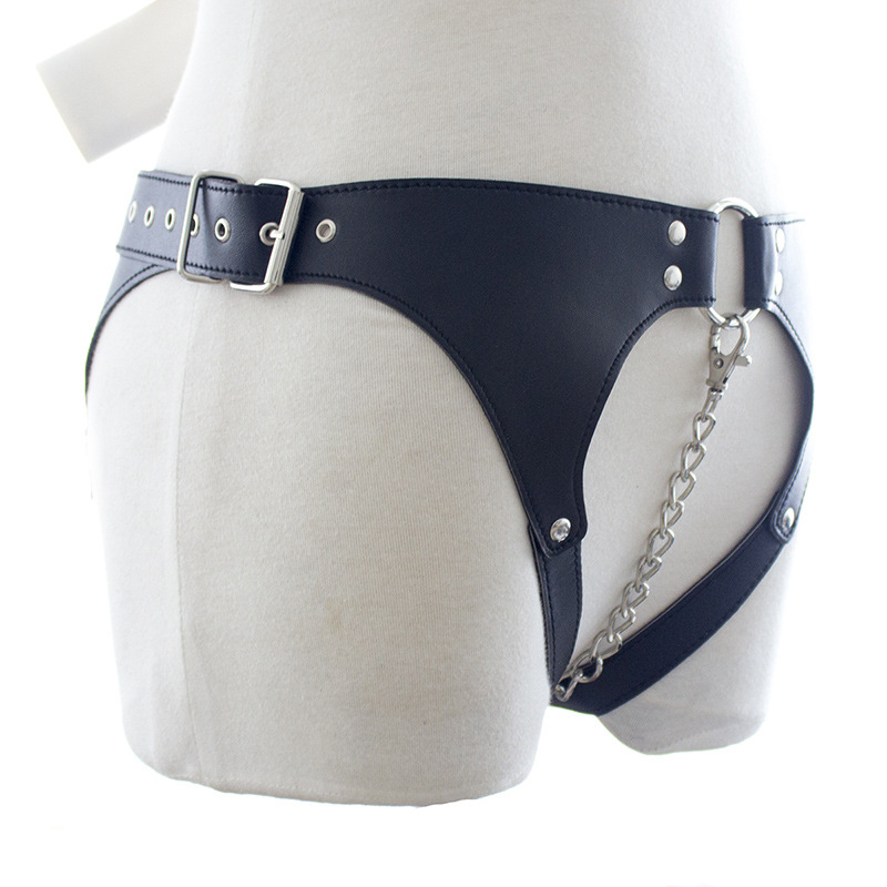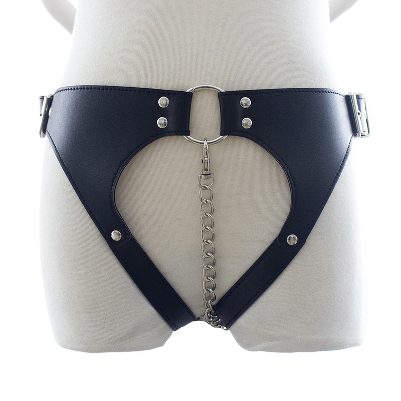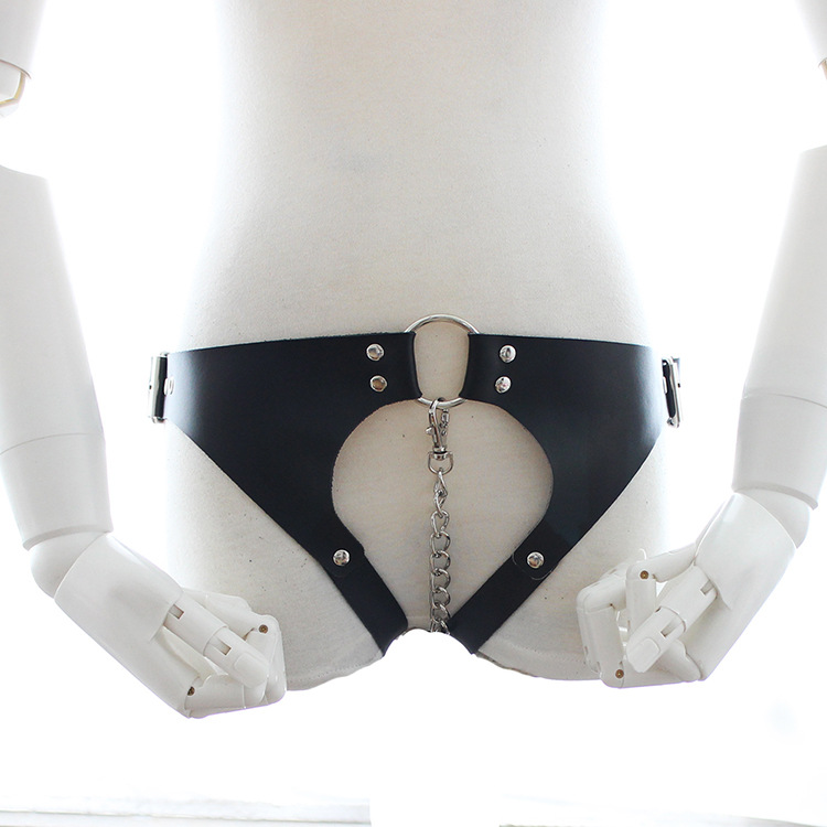 Confessions of Georgina – Crotch-less Backless Leather Chastity Harness. High Quality Soft Real Leather. Sturdy, soft and comfortable all describe this chastity belt that is meant for rough double penetration BDSM role play. “Remember, no talking. If you do, I’ll gag you after I’ve punished you. I expect perfection. Anything less is punished.” Leather on the straps is 0.1 inch thick. Front locking chain inserts in the vagina to protect the wearer’s chastity. Designed and hand crafted in Amsterdam for the bondage community worldwide. Color black. One Size Fits Most with adjustable side buckles.