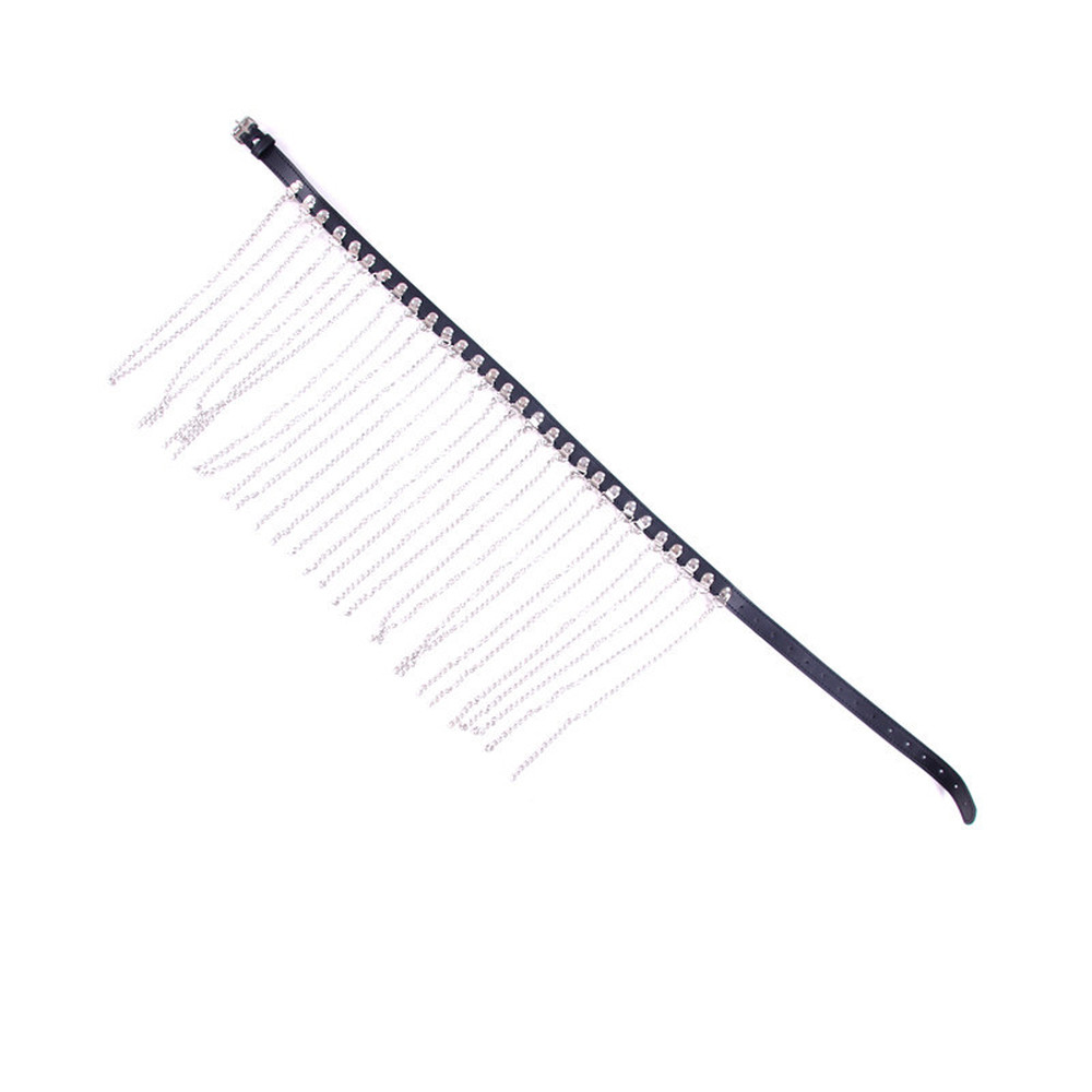 This suit, with sexy chain tassel detail, has belt buckle fastening chest and waist straps.