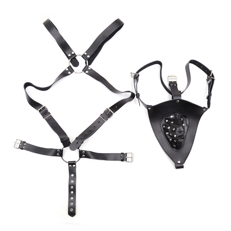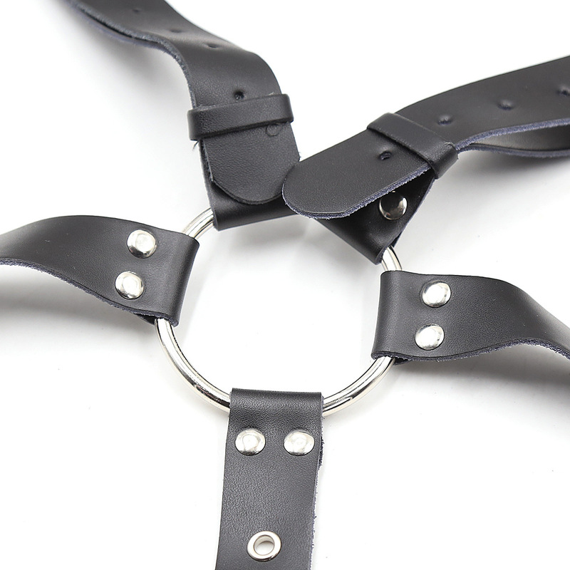 Buckle up faux leather harness, O rings connecting shoulder, chest and waist straps.