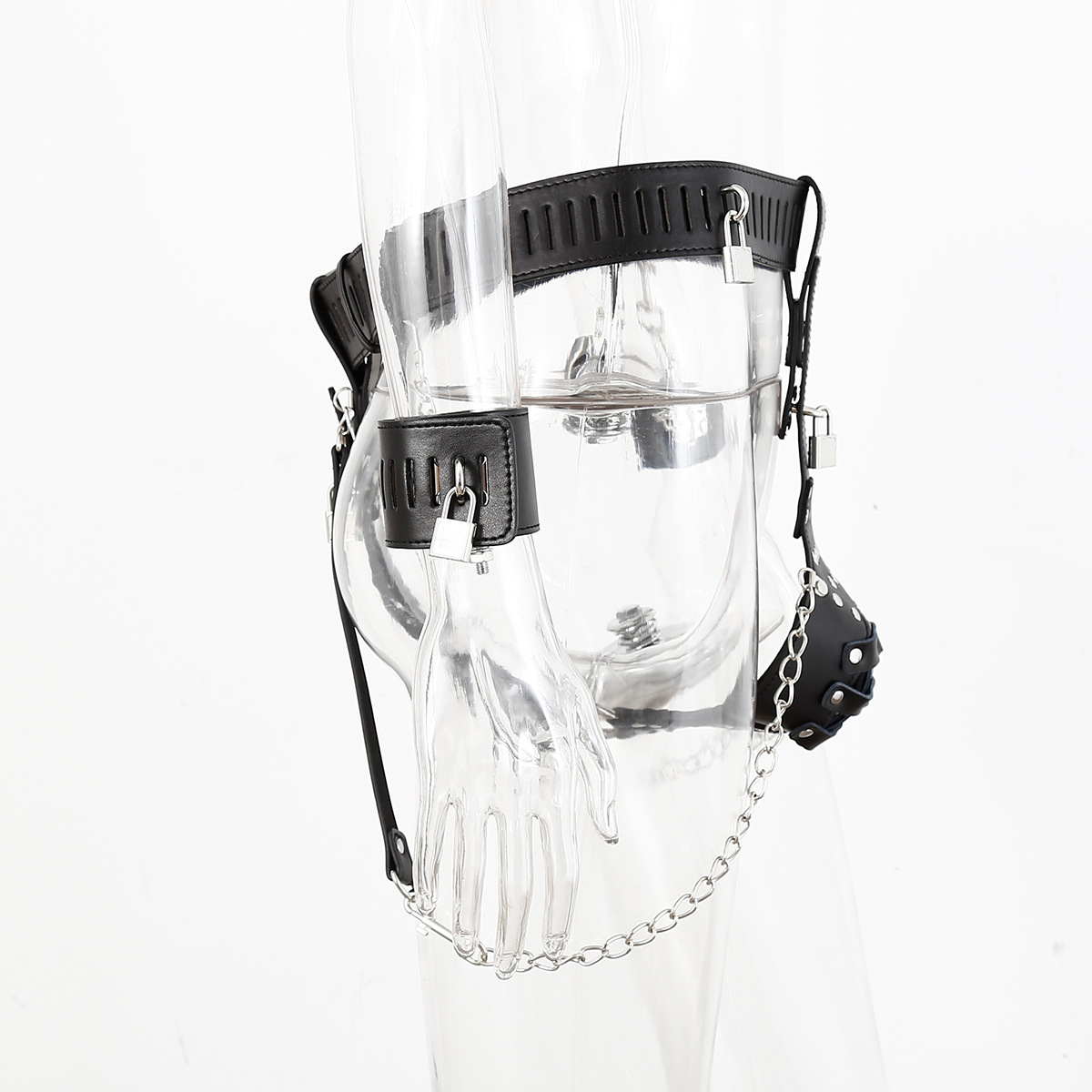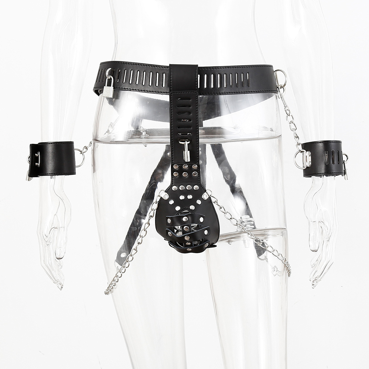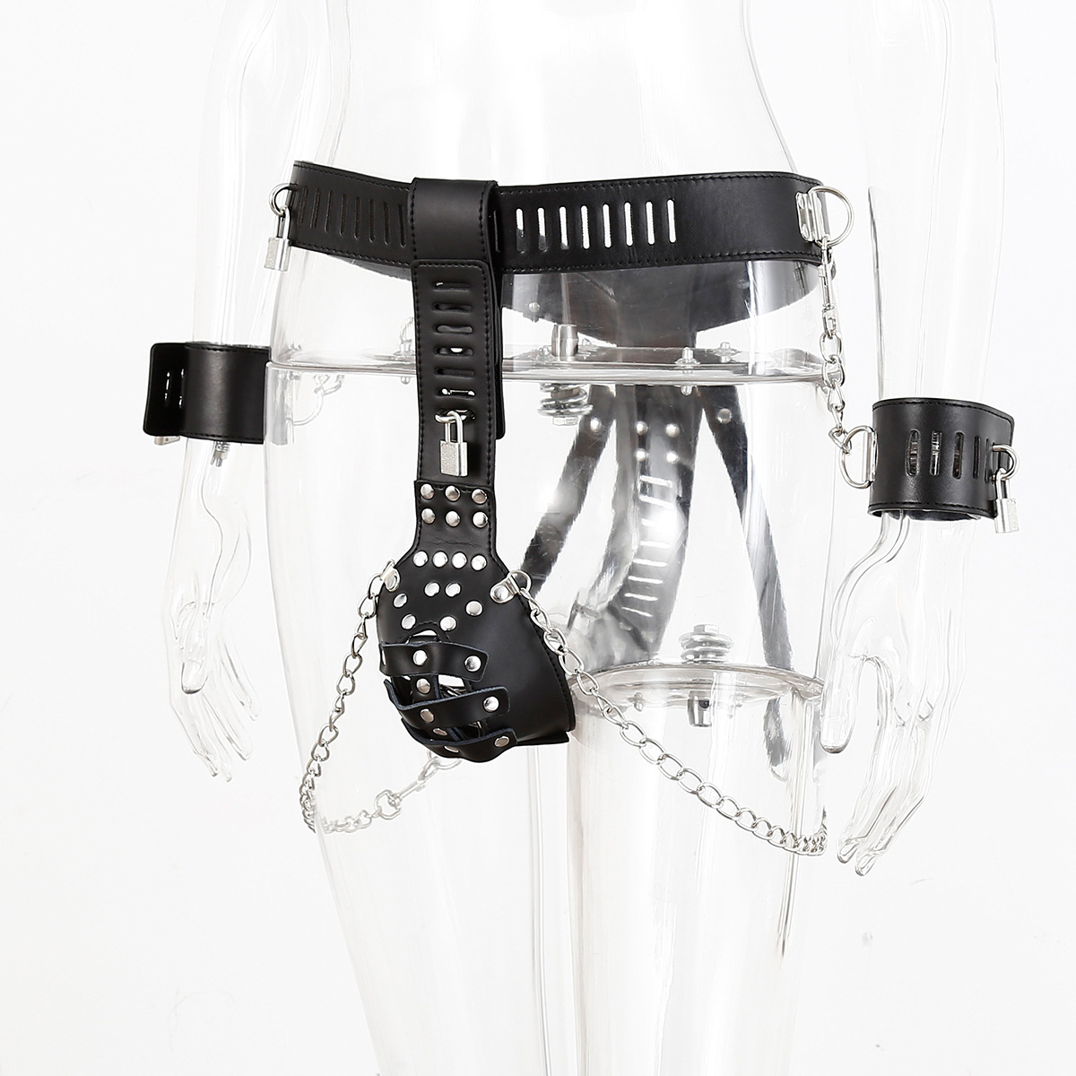 A leather chastity belt that also offers wrist…