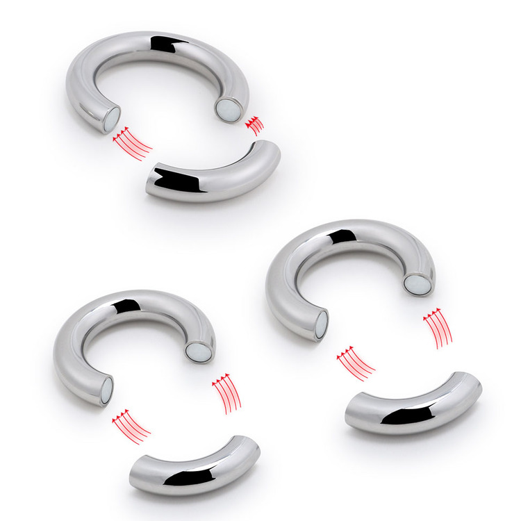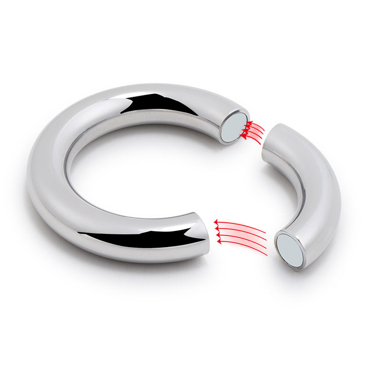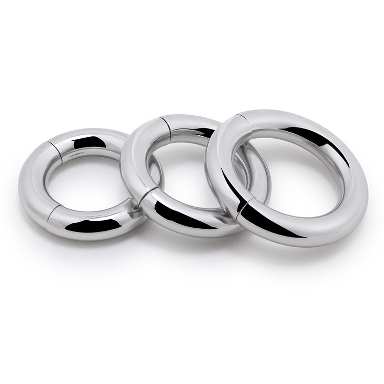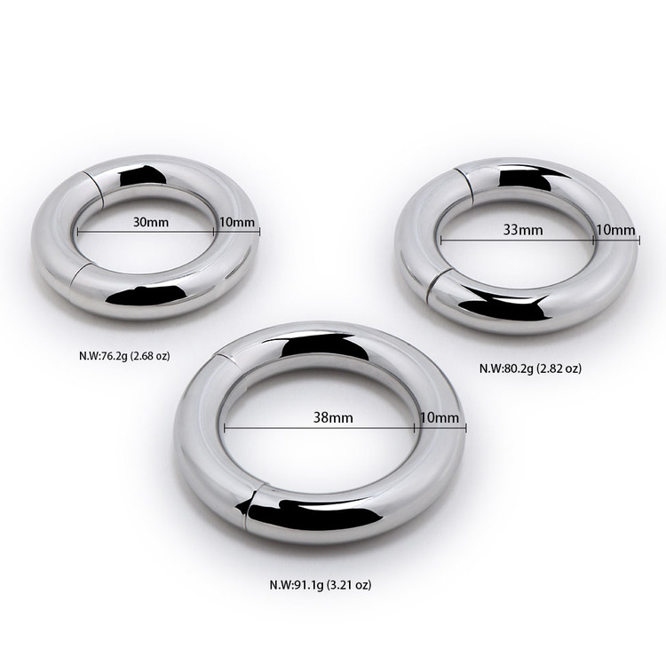 Weighing in at a whopping 7.5 oz, this ball-stretcher will get the job done simply with the sheer force of gravity! Made of highly durable stainless steel, this heavy ring will pull down on your scrotum to create a unique sensation that will amplify a sexual experience on your own or with a partner. The powerful magnetism within the ring allows it to easily open and securely close. This attractive and distinct accessory is compatible with all types of lubricant and cleans with mild soap and warm water.?Material: MetalColor: SilverDia:?S: 3 CM/1.2″M: 3.3CM/1.3″L: 3.8CM/1.5″Thickness: 1 CM/0.4″Package: OPP Bag