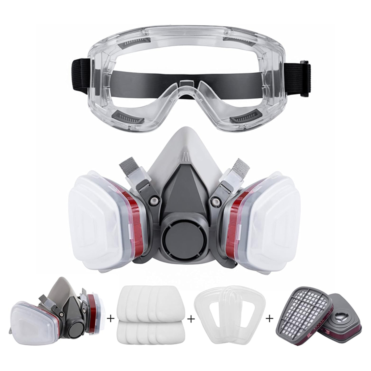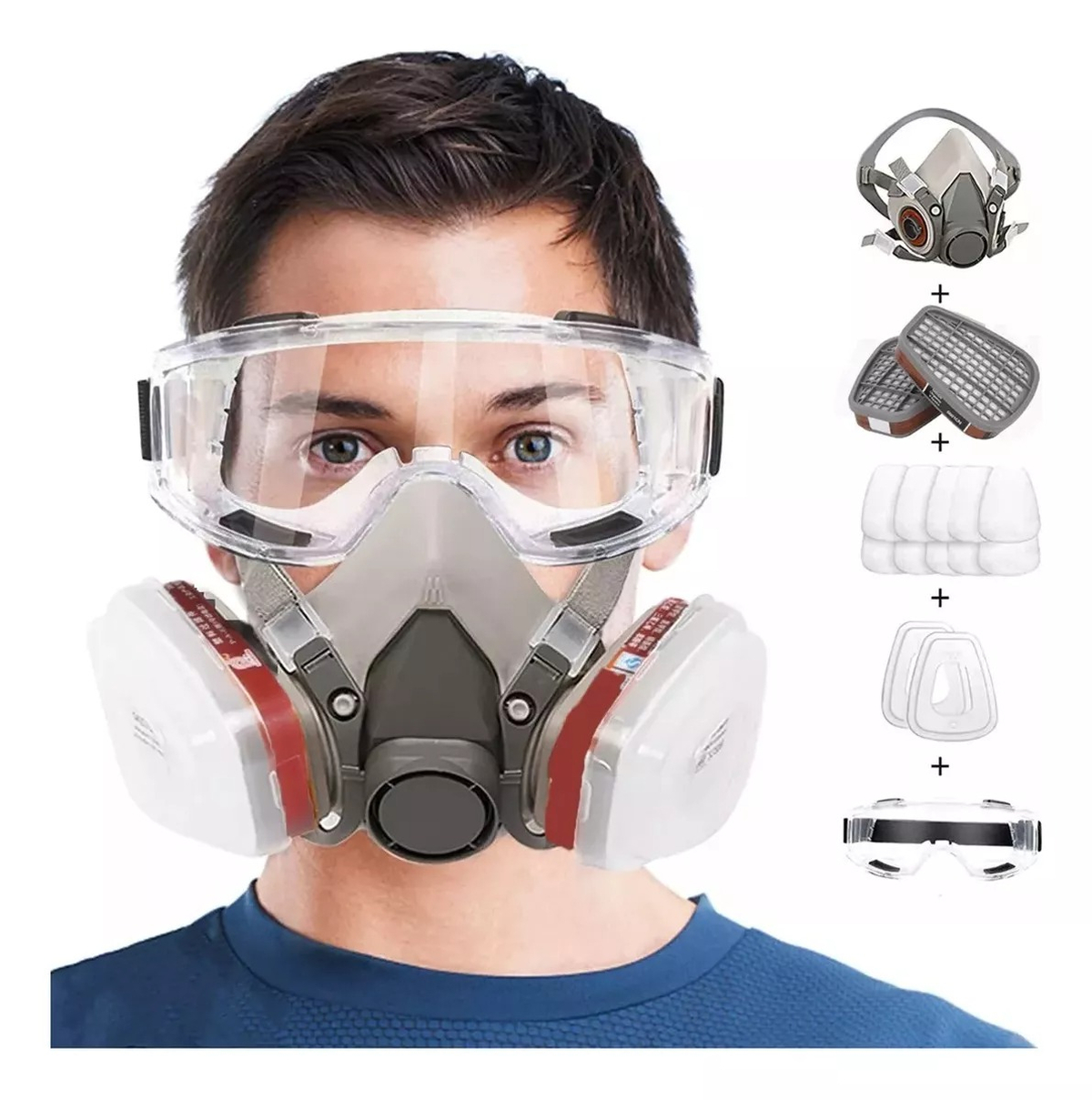 Product list: 1 x half mask 1 x safety goggles 2 x replaceable filter box 2 x plastic cover 10 filter cotton