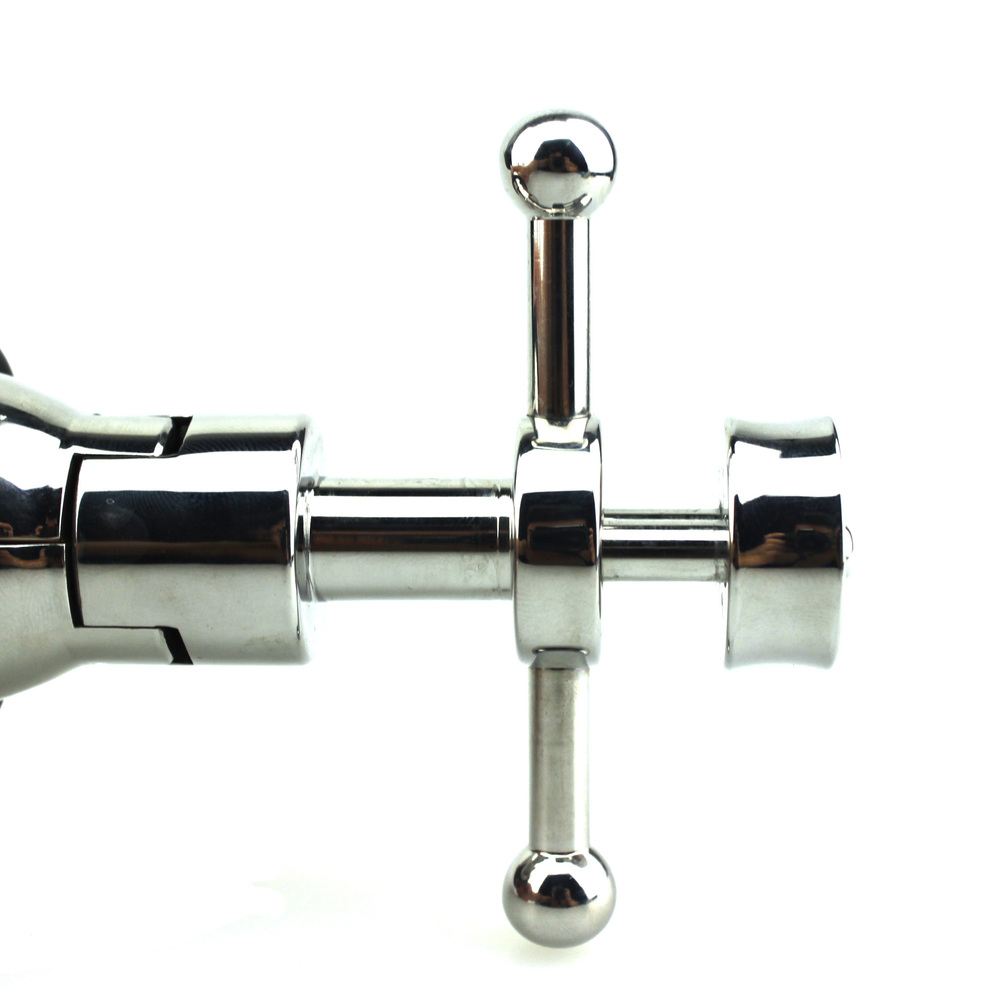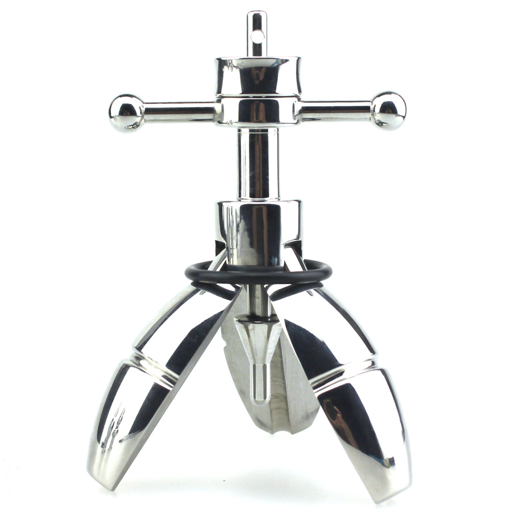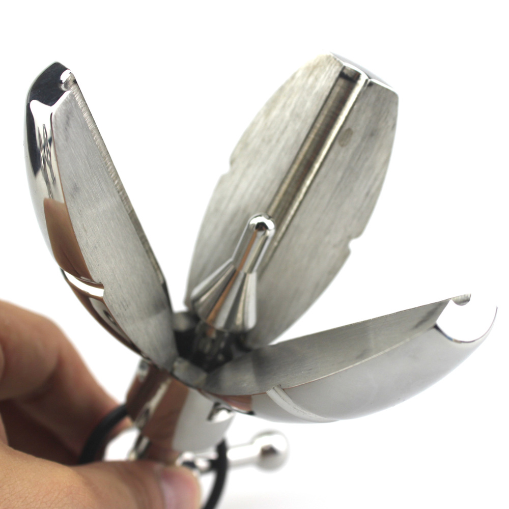 The Trillium Steel Locking Anal Plug is the perfect toy for fans of both bondage and anal play. As a simple butt plug, insert the cool steel bulb into your sub, leaving the rubber ring in place to keep the three Trillium steel petals together to maintain the traditional plug shape. Remove the ring and after sliding the plug into place, press down on the outer steel disc at the base of the plug to cause your Trillium to spread its petals and bloom inside. To keep this devious device spread open and your naughty sub from removing their toy, attach the included padlock through the post at the base of the plug. Measurements: 5.63 inch overall length, 2.25 inch long expandable bulb, Collapsed Bulb has 1.8 inch max insertable diameter, Expanded Bulb has 2.58 inch max insertable diameter. Material: Steel, Rubber.?