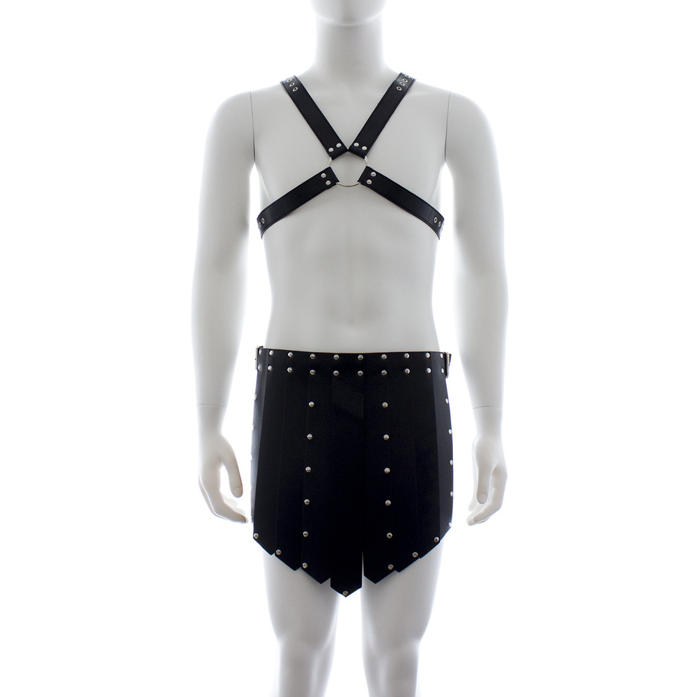 This X-shaped body harness has O-ring connecting straps and belt buckle front and back.