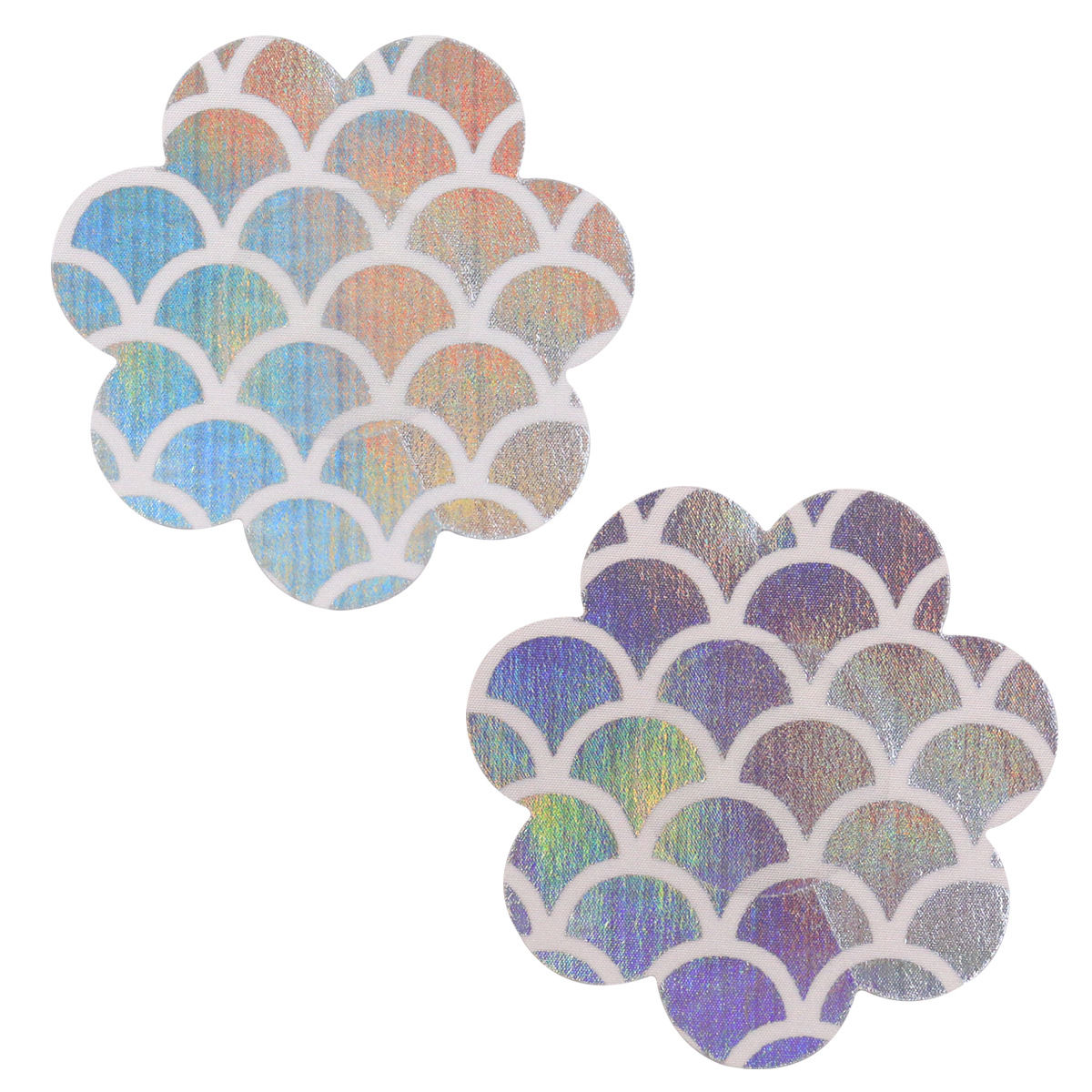 The holographic mermaid scale design adds a touch of whimsy and magic to any outfit, while the easy peel off backing and soft satiny texture make them a breeze to wear. Plus, they are hypoallergenic and latex free, making them suitable for even the most sensitive skin. These pasties are perfect for braless days, under fishnet or sheer tops, raves, festivals, club nights, costumes for Halloween, Valentines Day, beach days, or just a special night in.Function: Sexy adhesive nipple protectorsColor: SilverSize: 7.5 * 7.5 cm/2.96 * 2.96 inchMaterial: SatinPackage: OPP BagFurther: Self-adhesive/Disposable