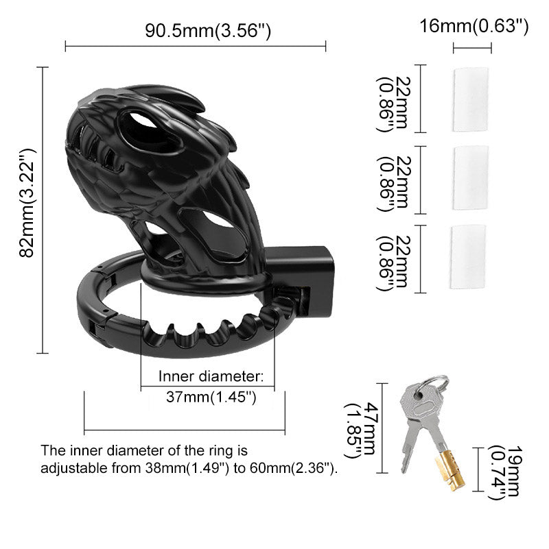 Its monster/dinosaur form is a noteworthy aspect of its look. Your penis looks like a superhero ready for combat thanks to the intimidating, 3D-printed design, which has a strong visual effect.You can stop worrying about heat and moisture thanks to the cage’s numerous ventilation holes. Additionally, it features a specific urination hole at the top, which merely limits your erection and doesn’t get in the way of your everyday activities.Color: BlackMaterial: ABS ResiSize: 8.2 * 3.7 cm/3.23 * 1.46 inchNet Weight: 59 g/0.13 lb/2.08 ozRing Adjustable Range: 38mm(1.49″)-60mm(2.36″)