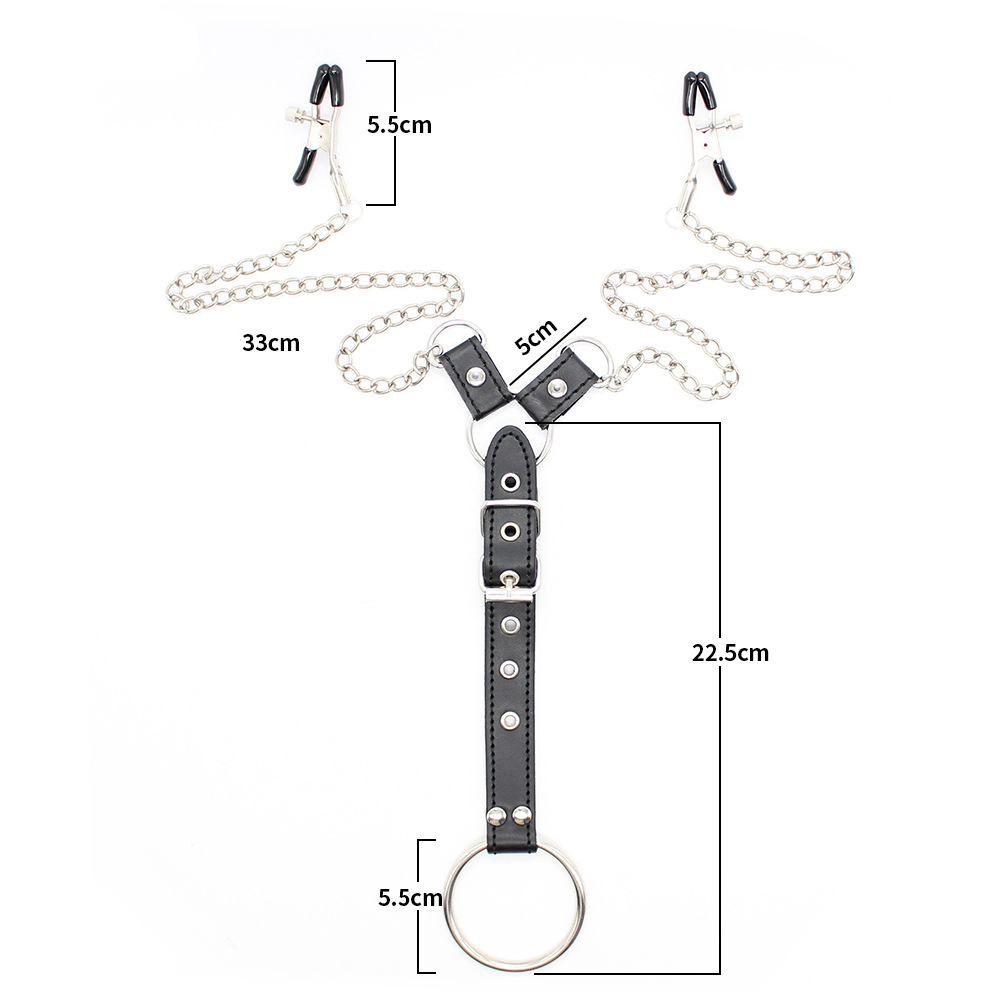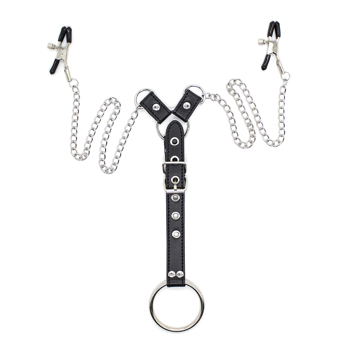 The clamps themselves are classically styled with an alligator shape that features completely adjustable tension. They’re weighted by hardy metal chains that connect to a sturdy O-ring, which in turn connects to a sexy leather-look height strap and metal cock ring. ?Fits most.