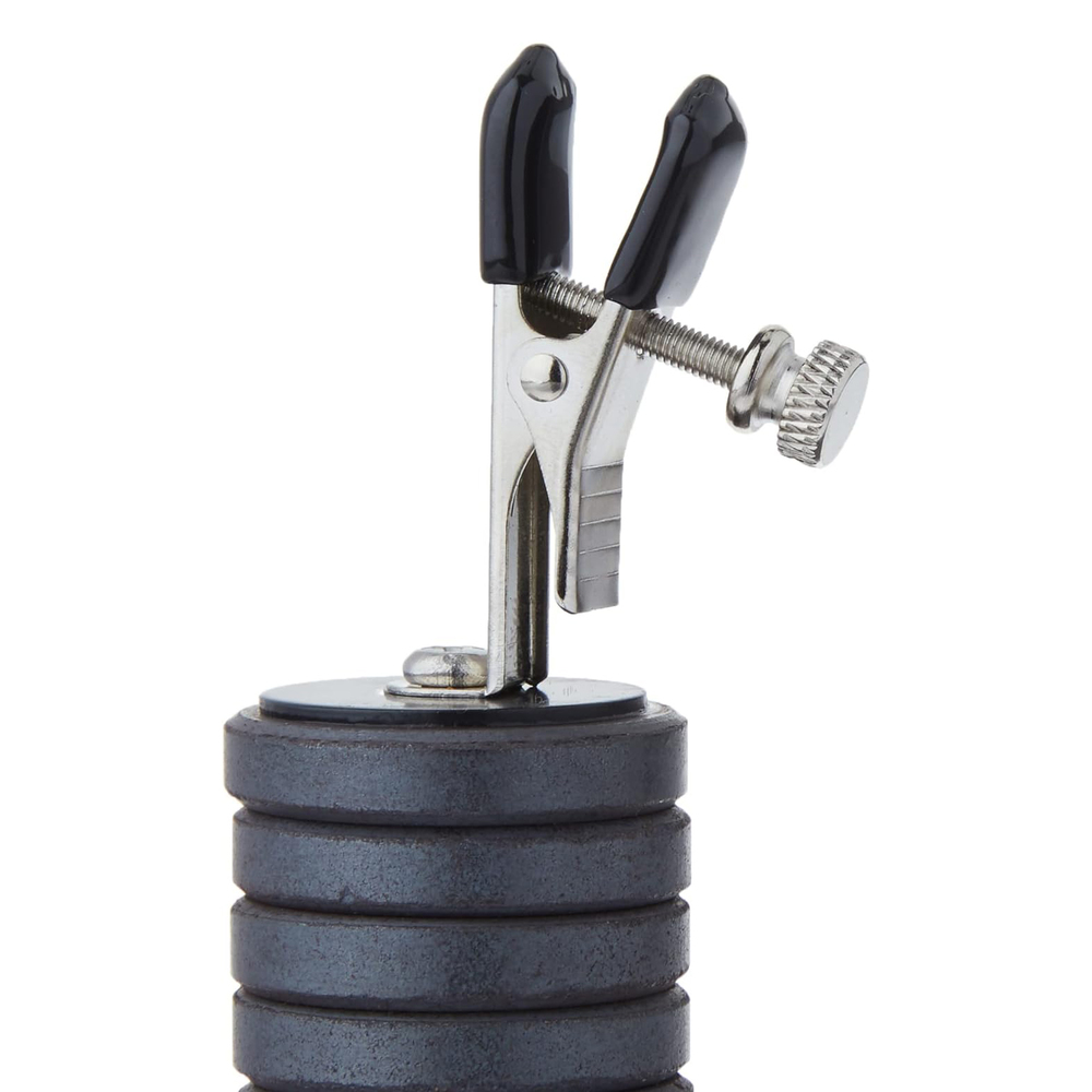 When placed just so, this single alligator style clamp is designed to add graduated pressure to the sensual areas of your plaything. You decide if they deserve light pressure or an intense pinch. Onus comes to you with a rubber tipped clamp with a twist-up adjuster, and 6 removable 1 oz. magnet weights. Your plaything will enjoy the customizable weight of the magnets alongside the graduated pressure.Measurements: 3 inches in total length, clamp opens to approximately 0.5 inches wideMaterial: Steel, vinyl, and magnetsColor: Silver