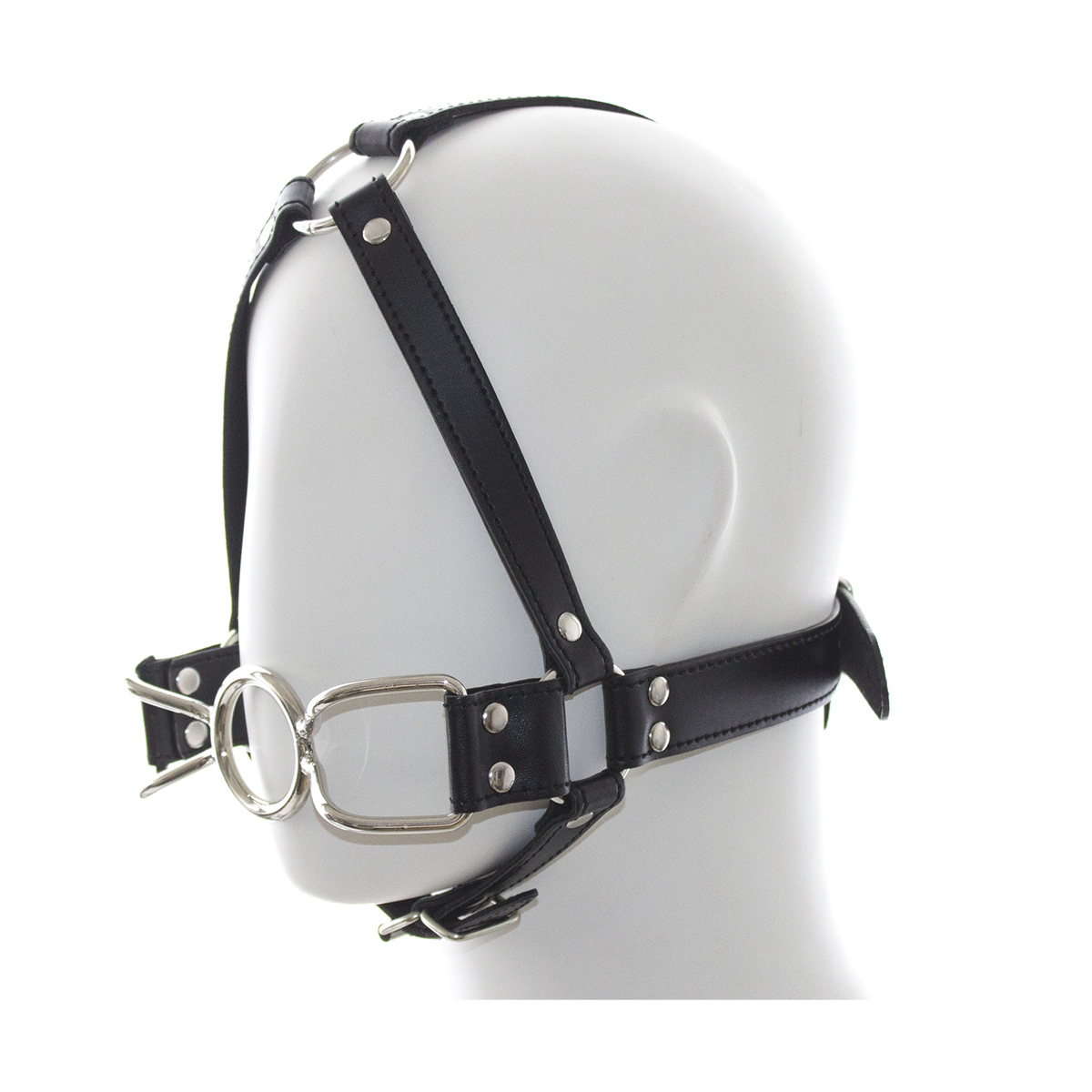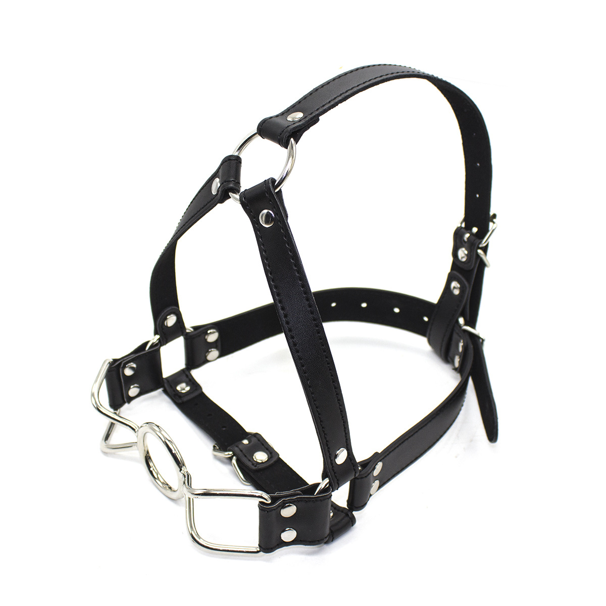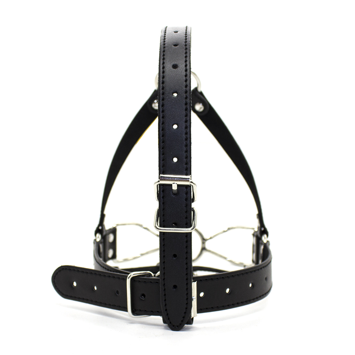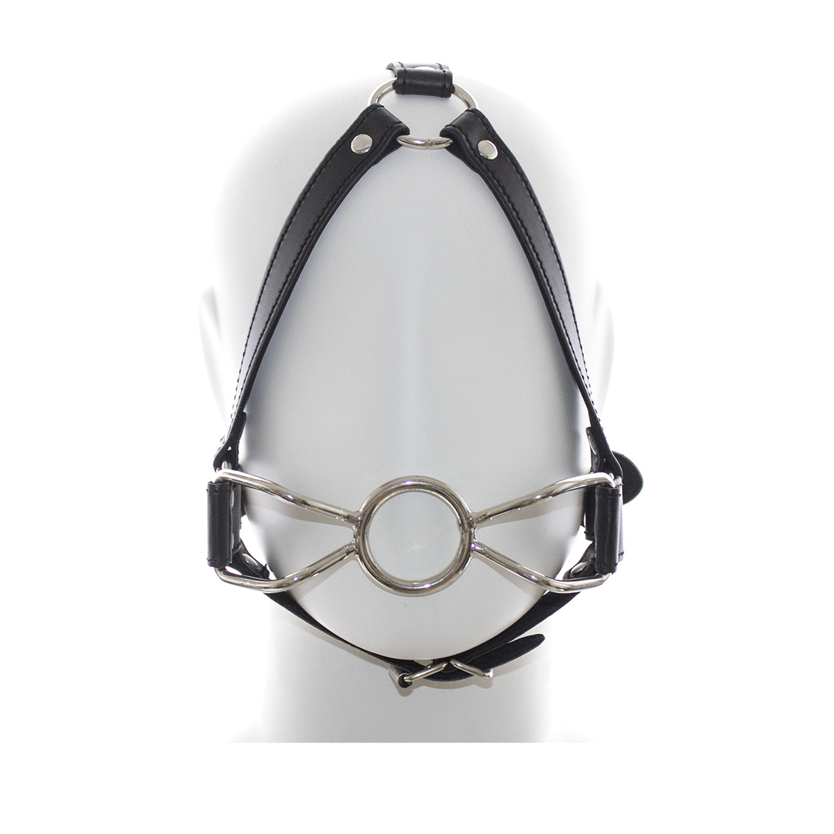 The Spider Gag is an innovative metal open mouth gag. The gag has an O shaped ring in the centre and handle shaped ??spider legs?? on each side of the ring which explains its name. The legs restrain and keep the ring inside the mouth if you choose and can be custom bent to fit your subs face. The Black strap with a locking buckle keeps the piece firmly in place while the head straps that move over the front of the head to the rear will slightly cover your subs eyes restricting vision. This gag is very adjustable and will fit most head sizes.